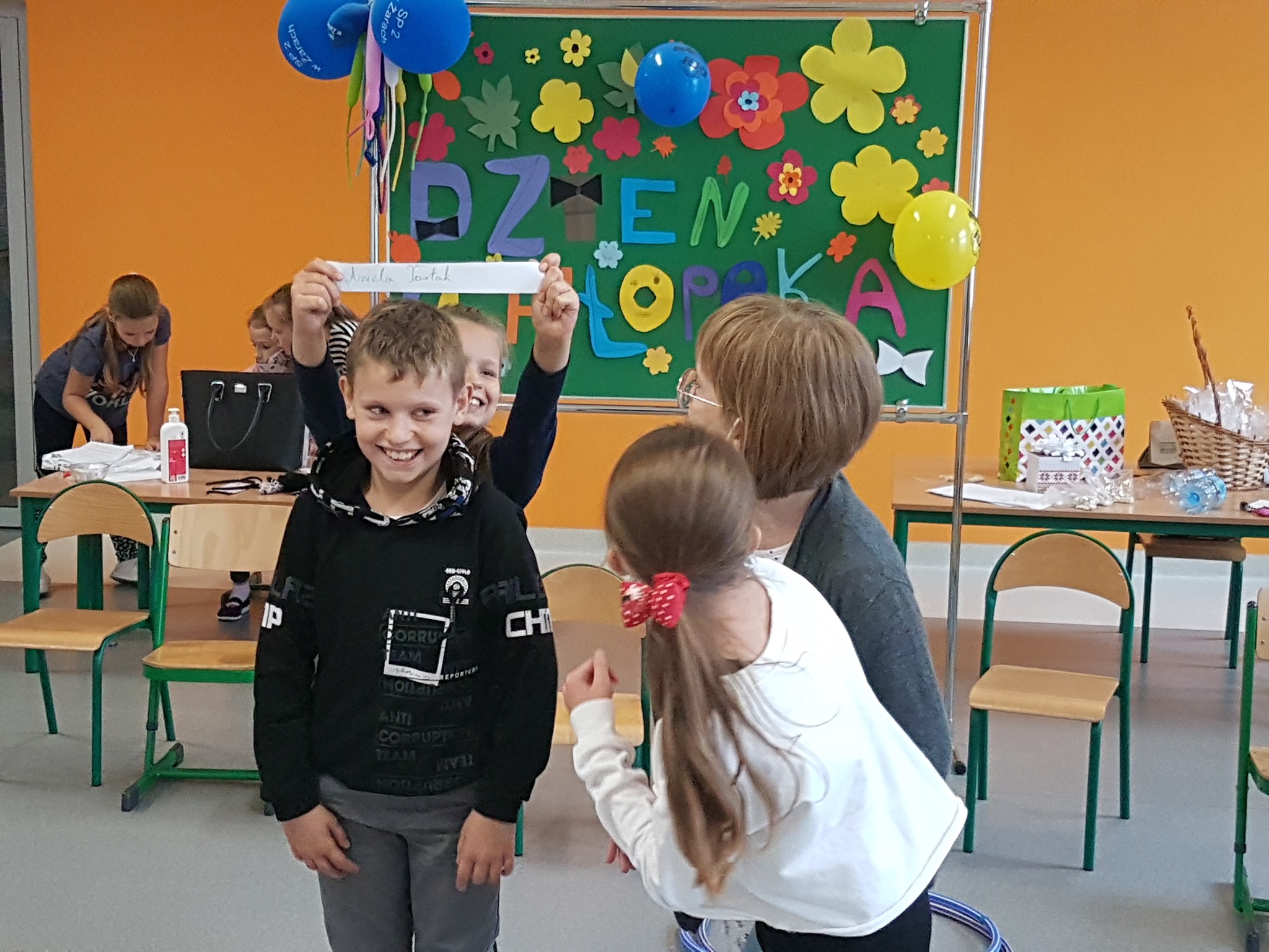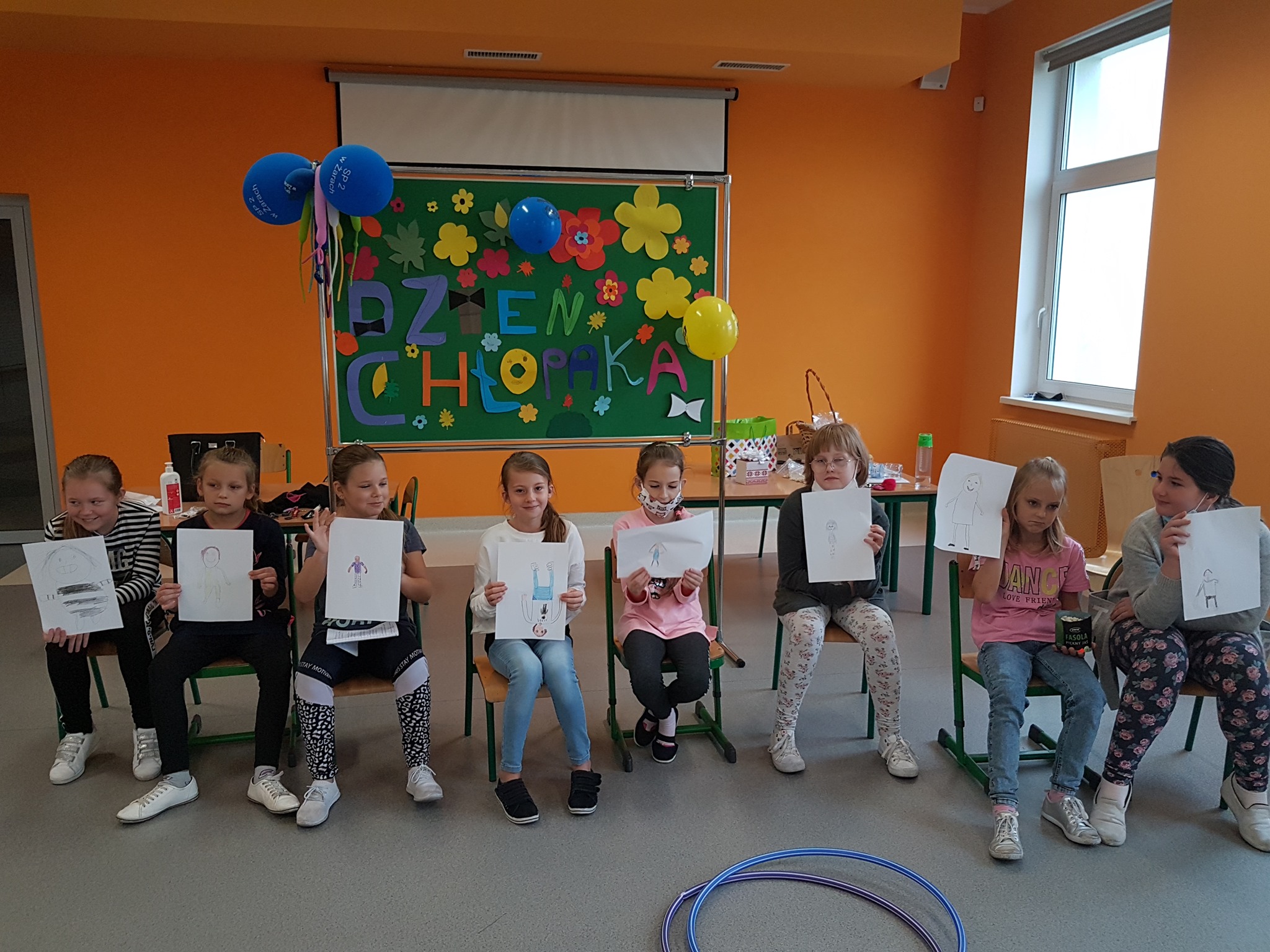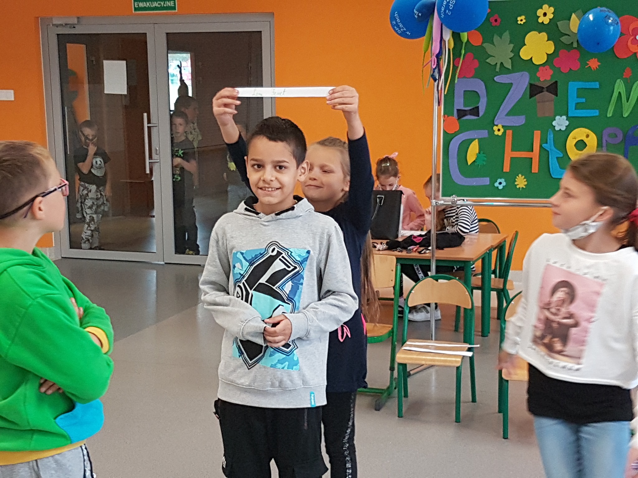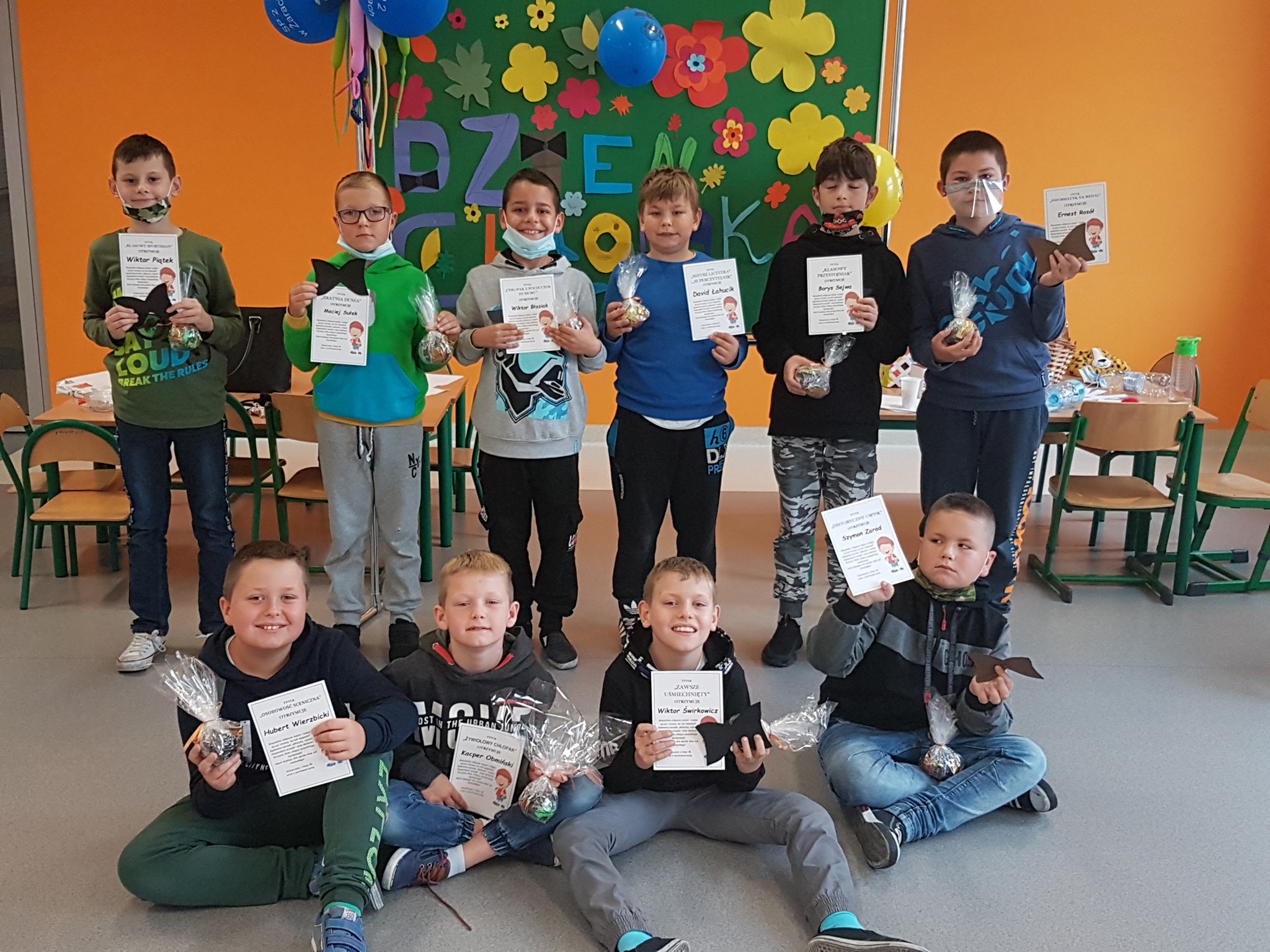 30 września chłopcy z 4b obchodzili swoje święto. Dziewczyny przygotowały swoim kolegom wspaniałą niespodziankę. Stołówka zamieniła się w salę zabaw. Impreza odbywała się pod hasłem: „Dżentelmen z klasą”. Chłopcy przeszli szereg ciekawych konkurencji, w których musieli wykazać się sprytem, wiedzą i pomysłowością. Pierwszą z nich były kalambury pt. „Znam te tytuły”, z którą świętujący poradzili sobie bez problemu. W kolejnej pod hasłem: „Bystre oko” musieli puścić wodze wyobraźni i wykorzystać swoje plastyczne umiejętności, by stworzyć portrety klasowych koleżanek. Dziewczyny z łatwością rozpoznały się na arcydziełach malarskich. Jak na czwartoklasistę przystało, każdy musi opanować umiejętności matematyczne, a te łatwo można było sprawdzić na fasolkach, które uczniowie policzyli błyskawicznie. Zadanie pod hasłem „Znawca aut” wymagało od chłopców skupienia, ponieważ sprawdzało ich wiedzę na temat marek samochodów. Rozpoznanie jak największej liczby emblematów marek samochodowych to nie lada zadanie. Tylko nielicznym się to udało. W konkurencji „Sportowiec na medal” chłopcy musieli przemierzyć przygotowany tor przeszkód. Marsz z książką na głowie, przysiady, pompki – jednym słowem gimnastyka na całego. Wszyscy byli dzielni i wytrwali. Wiele emocji wywołała zabawa „Zgadnij, kto to!”, gdzie uczestnik musiał odgadnąć imię koleżanki z klasy, o której wypowiadali się pozostali. Dziewczyny miały okazję dowiedzieć się o swoich zaletach, a było ich sporo. Na zakończenie chłopcy otrzymali upominki i słodkości. Dziewczyny uhonorowały ich także zabawnymi tytułami. „Historyczny umysł”, „Zawsze uśmiechnięty”, „Chłopak z poczuciem humoru”, „Klasowy przystojniak”, „Mistrz liczydła”, „Klasowy sportsman”, „Roztańczony Mister” – to tylko niektóre z nich. Śmiechu było co nie miara. Klasowa impreza była niezwykle udana, a humory tego dnia dopisywały wszystkim.
