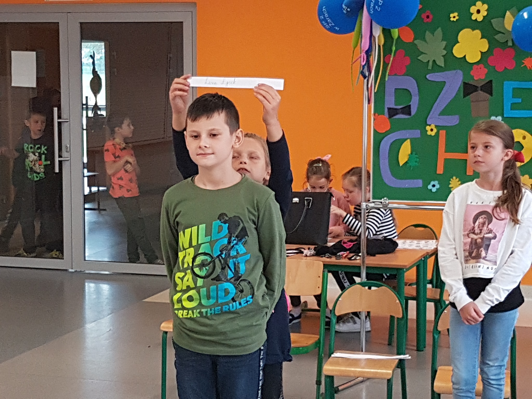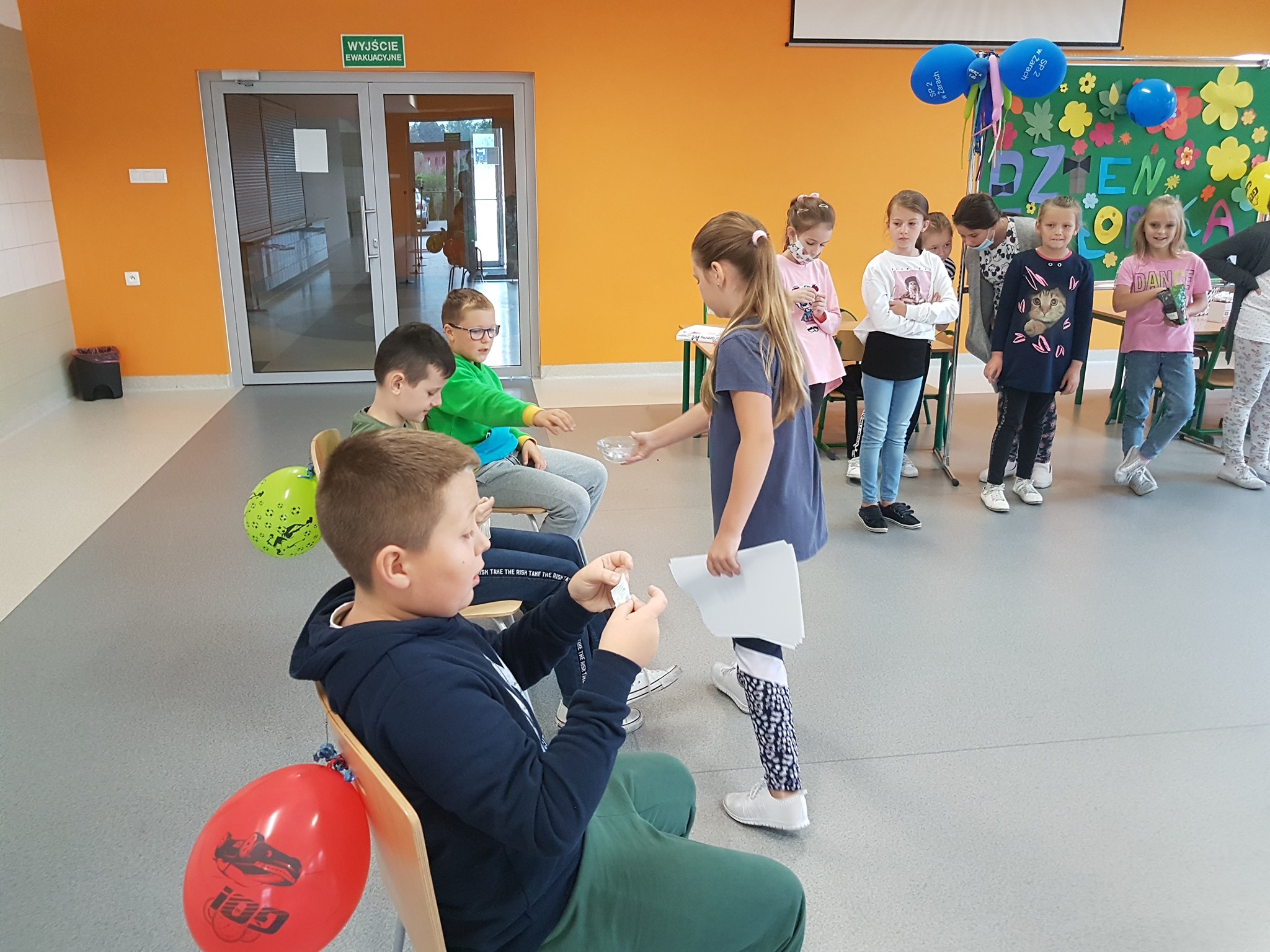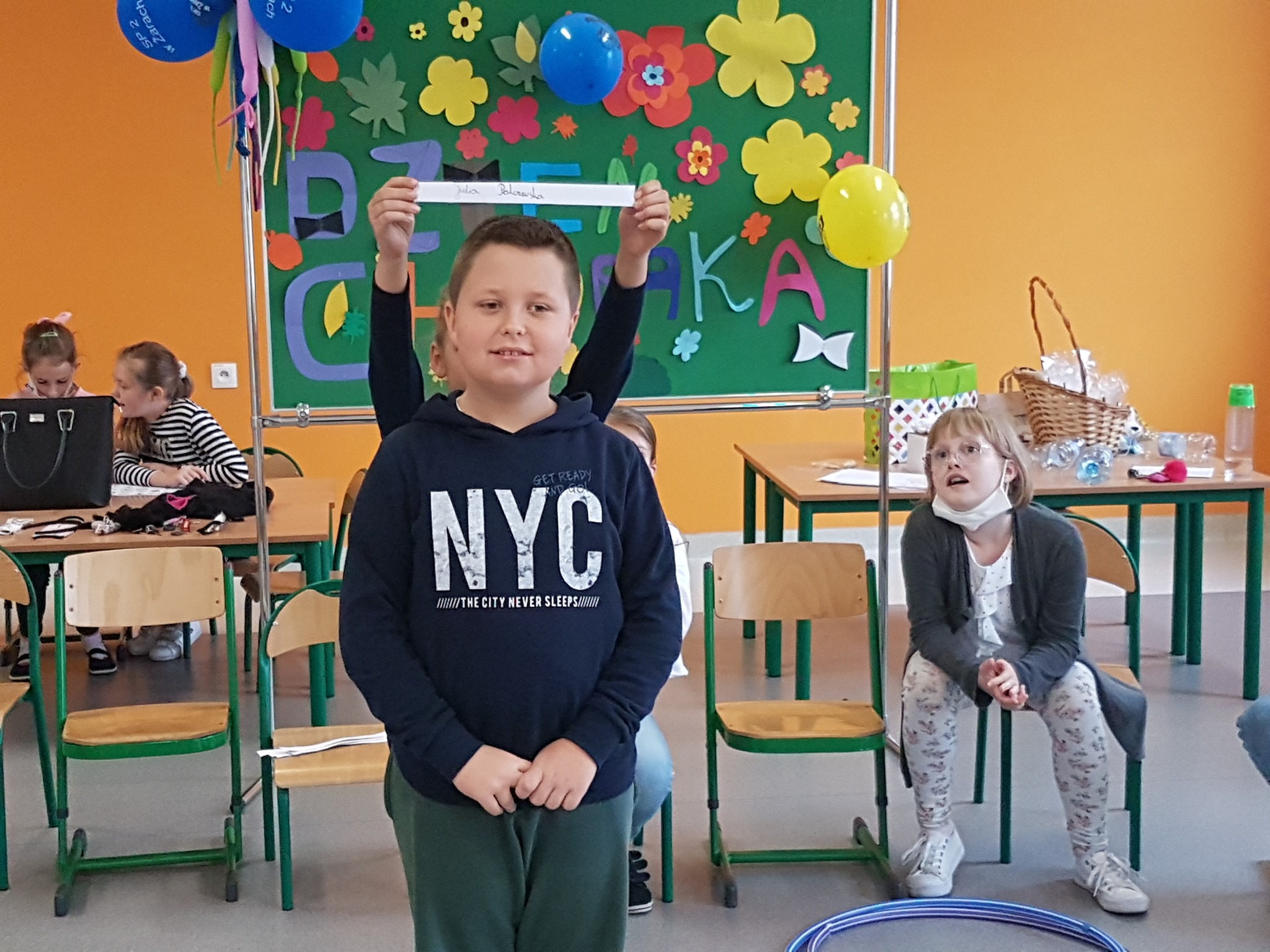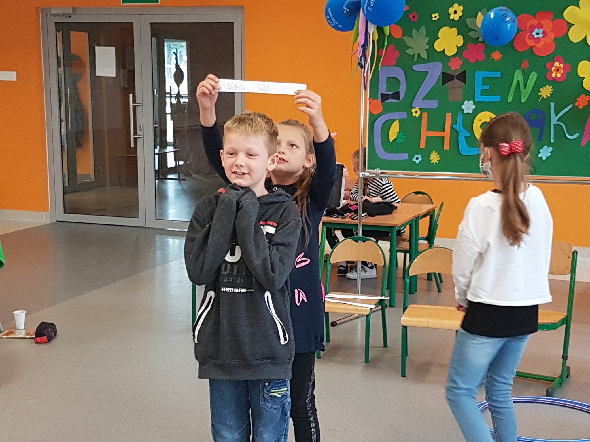 30 września chłopcy z 4b obchodzili swoje święto. Dziewczyny przygotowały swoim kolegom wspaniałą niespodziankę. Stołówka zamieniła się w salę zabaw. Impreza odbywała się pod hasłem: „Dżentelmen z klasą”. Chłopcy przeszli szereg ciekawych konkurencji, w których musieli wykazać się sprytem, wiedzą i pomysłowością. Pierwszą z nich były kalambury pt. „Znam te tytuły”, z którą świętujący poradzili sobie bez problemu. W kolejnej pod hasłem: „Bystre oko” musieli puścić wodze wyobraźni i wykorzystać swoje plastyczne umiejętności, by stworzyć portrety klasowych koleżanek. Dziewczyny z łatwością rozpoznały się na arcydziełach malarskich. Jak na czwartoklasistę przystało, każdy musi opanować umiejętności matematyczne, a te łatwo można było sprawdzić na fasolkach, które uczniowie policzyli błyskawicznie. Zadanie pod hasłem „Znawca aut” wymagało od chłopców skupienia, ponieważ sprawdzało ich wiedzę na temat marek samochodów. Rozpoznanie jak największej liczby emblematów marek samochodowych to nie lada zadanie. Tylko nielicznym się to udało. W konkurencji „Sportowiec na medal” chłopcy musieli przemierzyć przygotowany tor przeszkód. Marsz z książką na głowie, przysiady, pompki – jednym słowem gimnastyka na całego. Wszyscy byli dzielni i wytrwali. Wiele emocji wywołała zabawa „Zgadnij, kto to!”, gdzie uczestnik musiał odgadnąć imię koleżanki z klasy, o której wypowiadali się pozostali. Dziewczyny miały okazję dowiedzieć się o swoich zaletach, a było ich sporo. Na zakończenie chłopcy otrzymali upominki i słodkości. Dziewczyny uhonorowały ich także zabawnymi tytułami. „Historyczny umysł”, „Zawsze uśmiechnięty”, „Chłopak z poczuciem humoru”, „Klasowy przystojniak”, „Mistrz liczydła”, „Klasowy sportsman”, „Roztańczony Mister” – to tylko niektóre z nich. Śmiechu było co nie miara. Klasowa impreza była niezwykle udana, a humory tego dnia dopisywały wszystkim.