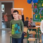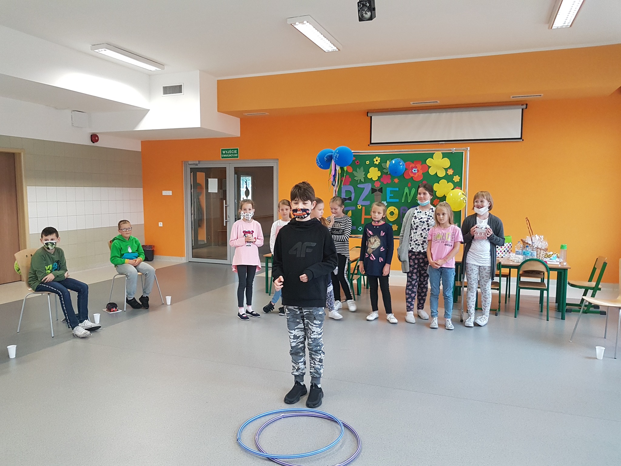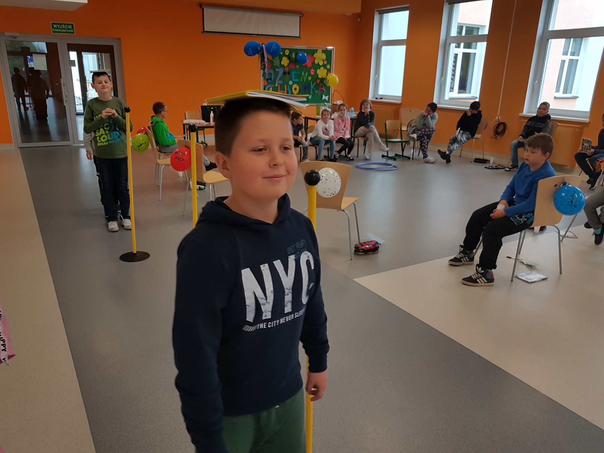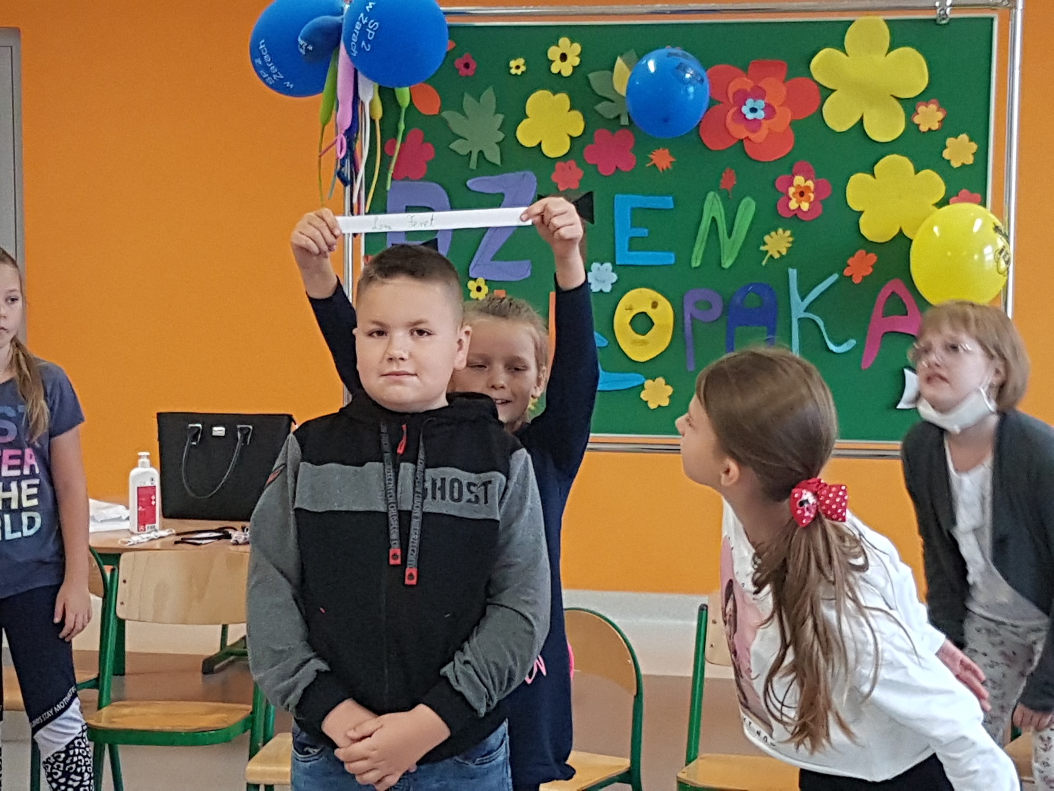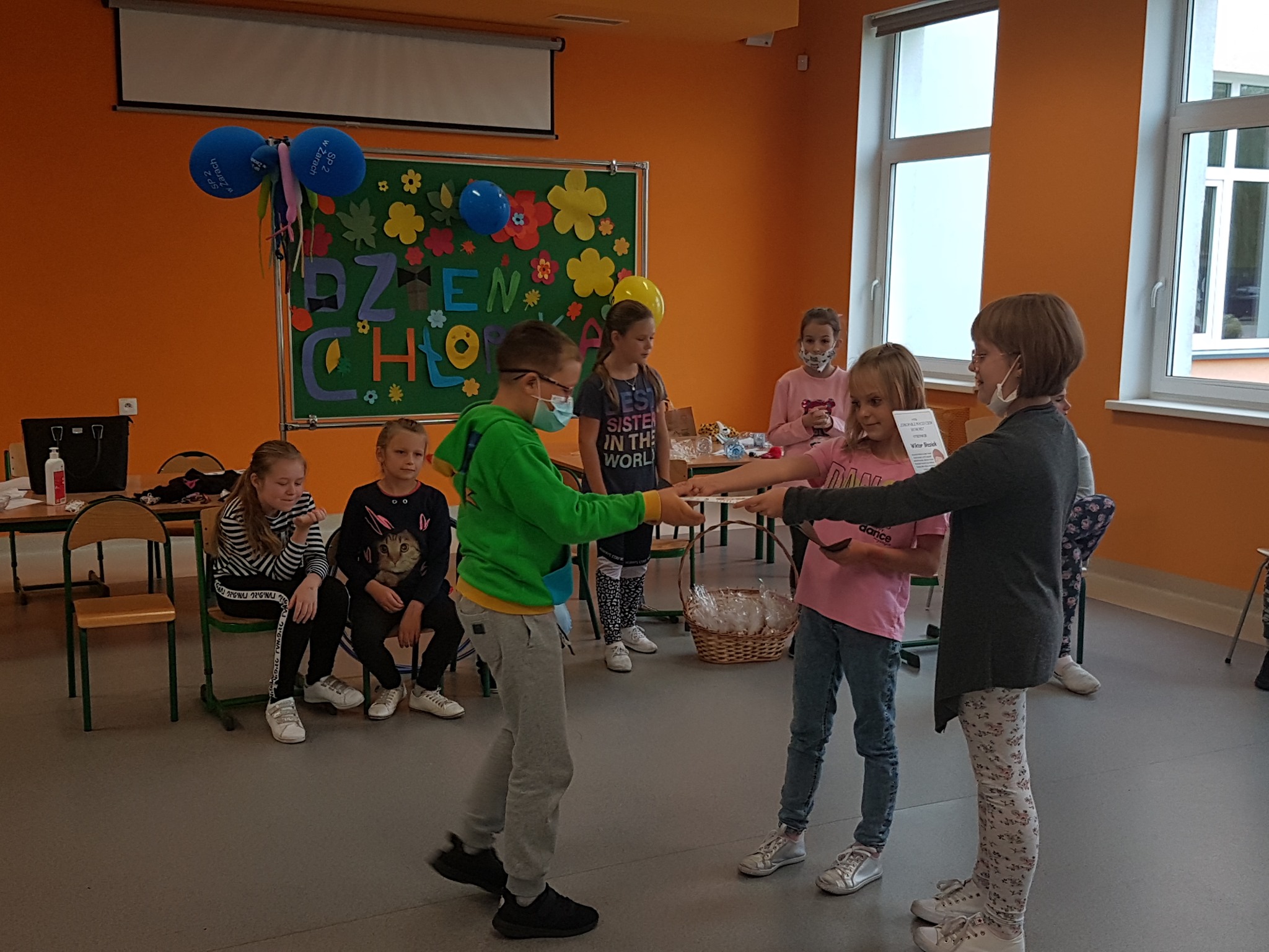 30 września chłopcy z 4b obchodzili swoje święto. Dziewczyny przygotowały swoim kolegom wspaniałą niespodziankę. Stołówka zamieniła się w salę zabaw. Impreza odbywała się pod hasłem: „Dżentelmen z klasą”. Chłopcy przeszli szereg ciekawych konkurencji, w których musieli wykazać się sprytem, wiedzą i pomysłowością. Pierwszą z nich były kalambury pt. „Znam te tytuły”, z którą świętujący poradzili sobie bez problemu. W kolejnej pod hasłem: „Bystre oko” musieli puścić wodze wyobraźni i wykorzystać swoje plastyczne umiejętności, by stworzyć portrety klasowych koleżanek. Dziewczyny z łatwością rozpoznały się na arcydziełach malarskich. Jak na czwartoklasistę przystało, każdy musi opanować umiejętności matematyczne, a te łatwo można było sprawdzić na fasolkach, które uczniowie policzyli błyskawicznie. Zadanie pod hasłem „Znawca aut” wymagało od chłopców skupienia, ponieważ sprawdzało ich wiedzę na temat marek samochodów. Rozpoznanie jak największej liczby emblematów marek samochodowych to nie lada zadanie. Tylko nielicznym się to udało. W konkurencji „Sportowiec na medal” chłopcy musieli przemierzyć przygotowany tor przeszkód. Marsz z książką na głowie, przysiady, pompki – jednym słowem gimnastyka na całego. Wszyscy byli dzielni i wytrwali. Wiele emocji wywołała zabawa „Zgadnij, kto to!”, gdzie uczestnik musiał odgadnąć imię koleżanki z klasy, o której wypowiadali się pozostali. Dziewczyny miały okazję dowiedzieć się o swoich zaletach, a było ich sporo. Na zakończenie chłopcy otrzymali upominki i słodkości. Dziewczyny uhonorowały ich także zabawnymi tytułami. „Historyczny umysł”, „Zawsze uśmiechnięty”, „Chłopak z poczuciem humoru”, „Klasowy przystojniak”, „Mistrz liczydła”, „Klasowy sportsman”, „Roztańczony Mister” – to tylko niektóre z nich. Śmiechu było co nie miara. Klasowa impreza była niezwykle udana, a humory tego dnia dopisywały wszystkim.