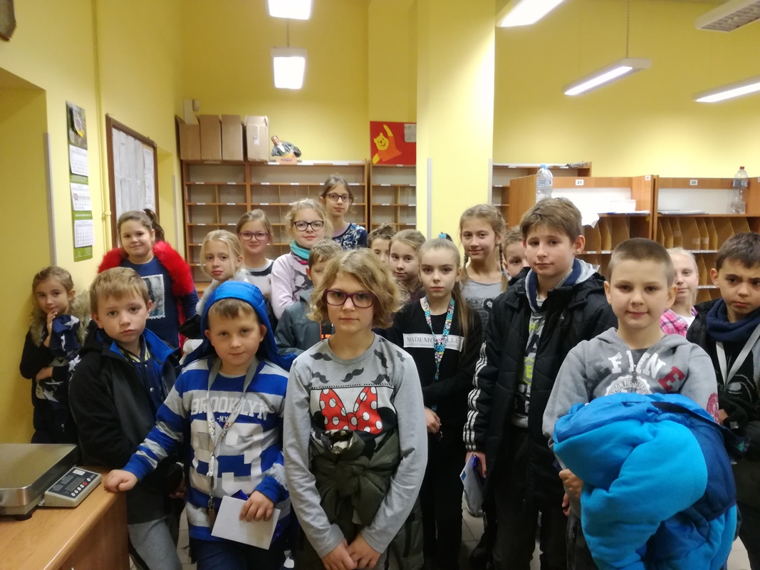 W październiku pocztowcy mają swoje święto, jest też Międzynarodowy Tydzień Pisania Listów. Z tej okazji, choć nieco spóźnieni, uczniowie klasy IV a odwiedzili pocztę dnia 6 listopada. Niektórzy mieli przygotowane listy do wysłania i po raz pierwszy kupowali znaczek. Michał Piskorowski w naklejaniu znaczka pocztowego przy użyciu własnego języka wykazał wyjątkową nadgorliwość, co skończyło się smarowaniem znaczka zwykłym klejem. Dużą frajdą były także ćwiczenia w posługiwaniu się datownikiem. Okazało się, że wcale nie tak łatwo przybić datę na kopercie, a tusz jest wyjątkowo trwały, o czym przekonał się Adrian Urbanowicz brudząc nim swoją buzię. Oprócz drogi, jaką przechodzi list od okienka do wysłania, uczniowie poznali zaplecze poczty, a w nim stanowiska listonoszy, przy których segregują listy ze swojego rejonu.