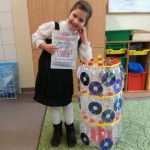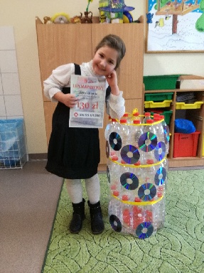 Gabriela Kowalska – Leśniak, uczennica klasy 1b zdobyła wyróżnienie w gminnym konkursie „Pan Sprzątalski „. Za swój kosz do zbierania nakrętek, dnia 26 stycznia w Lunie, odebrała upominek w postaci bonu na 130 zł. Prace konkursowe należało wykonać z odpadów. Musiała być to rzecz użyteczna. Pojemnik Gabrysi na pewno przyda się w klasie.