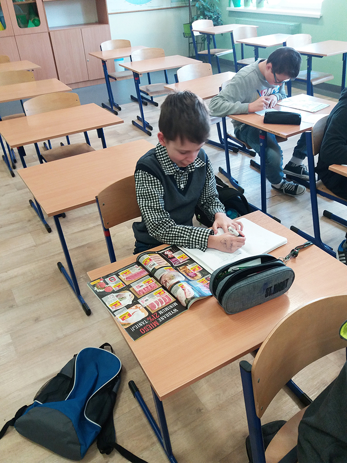 Czy ułamki dziesiętne można polubić? Na pewno można w ciekawy sposób nauczyć sie wykonywać na nich działania. Uczniowie klasy 5a i uczestnicy kółka matematycznego utrwalali wykonywanie działań matematycznych „robiąc zakupy” korzystając z gazetek reklamowych pobliskich sklepów. Nikogo nie trzeba było zachęcać do obliczeń. A hasło –Zamknięcie sklepu za chwilę  -mobilizowało do przyspieszenia obliczeń i „wkładania zakupów do koszyka”. Było dużo zabawy i każdy mógł wybrać swoje ulubione produkty.