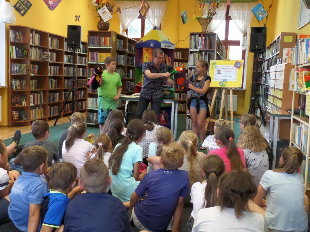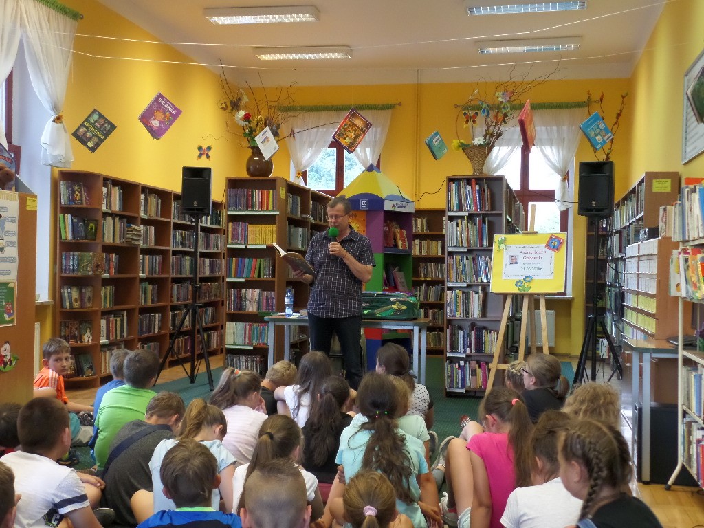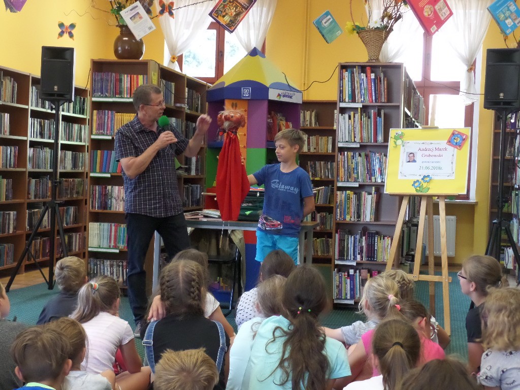 21 czerwca klasa IV a wzięła udział w spotkaniu autorskim w Oddziale dla Dzieci Miejskiej Biblioteki Publicznej w Żarach. Gościem był pan Andrzej Marek Grabowski. Autor telewizyjnych programów dla dzieci, książek, scenariuszy filmowych oraz wielu znanych piosenek, np. ” Kulfon, co z ciebie wyrośnie”, ” Witaminki”, „Kropelka złotych marzeń”. Spotkanie przebiegło w miłej atmosferze i okazało się być wesołą zabawą dla uczestników.