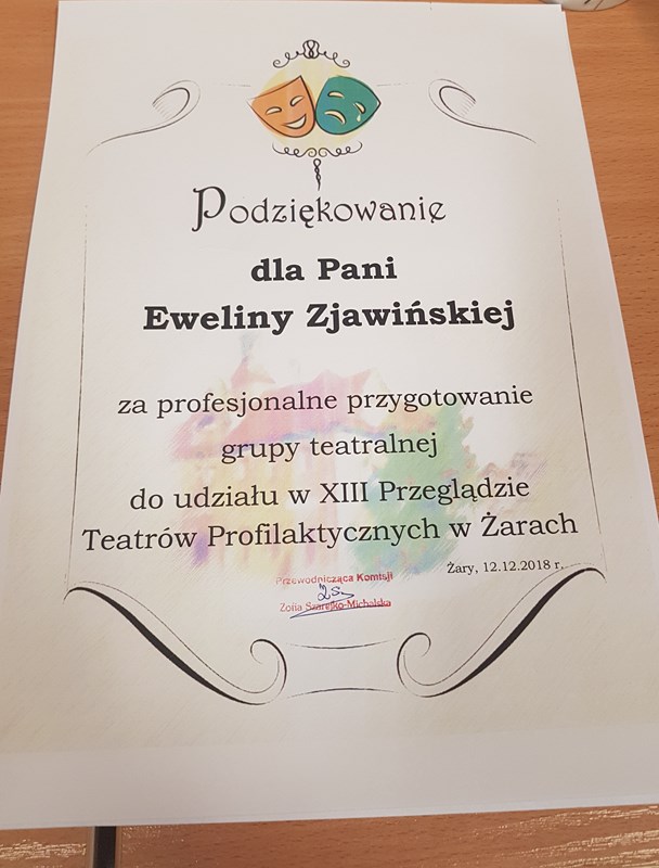 12 grudnia w żarskiej Lunie odbył się XIII Przegląd Teatrów Profilaktycznych w Żarach, organizowany przez Miejską Komisję Rozwiązywania Problemów Alkoholowych. Uczniowie reprezentowali naszą szkołę w spektaklu zatytułowanym ”Tajemnica”. Przedstawienie zostało przyjęte gromkimi brawami, a nasze „Cytrynki” zajęły ostatecznie II miejsce. Gratulujemy sukcesu i życzymy kolejnych.