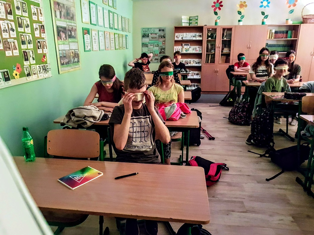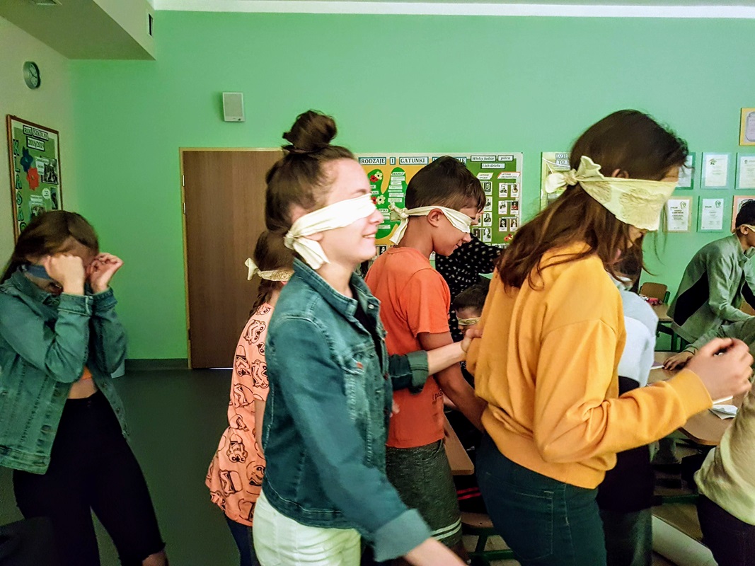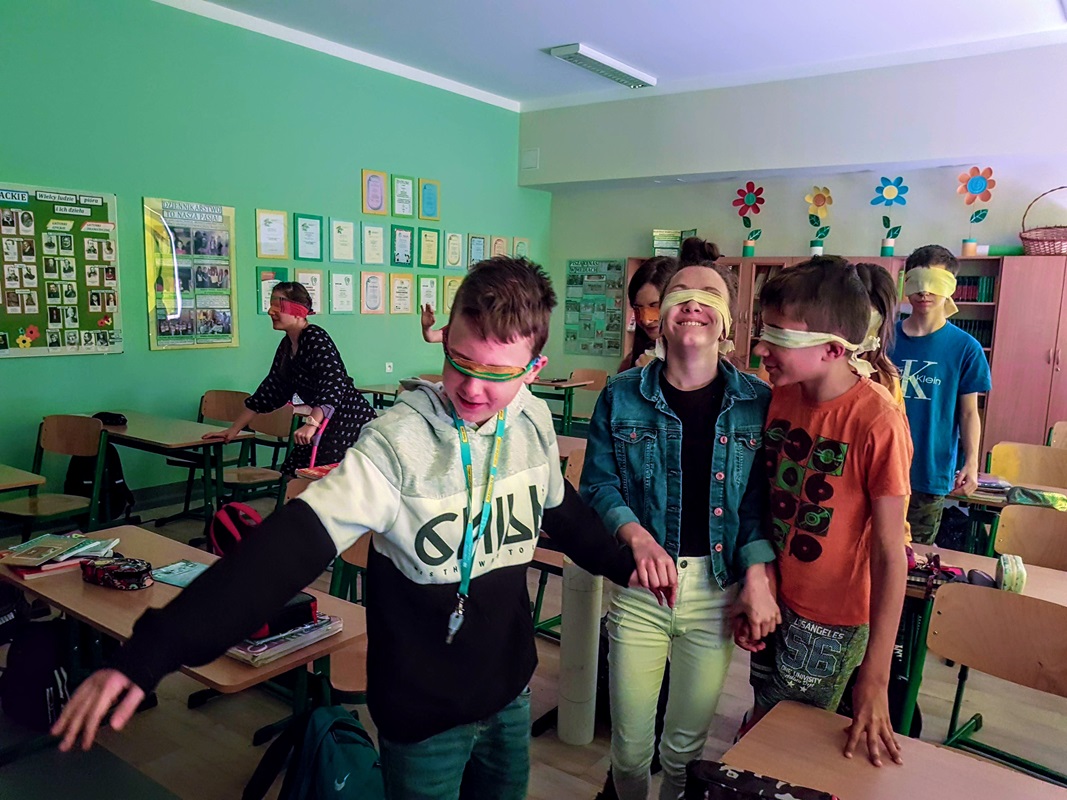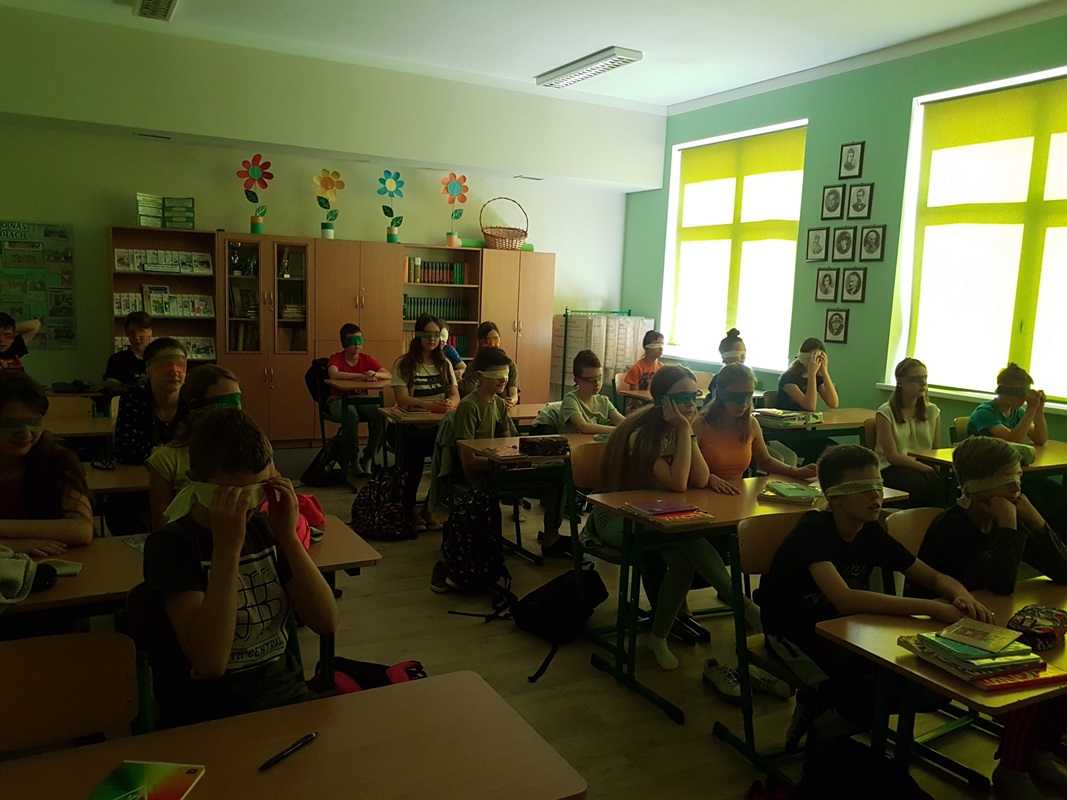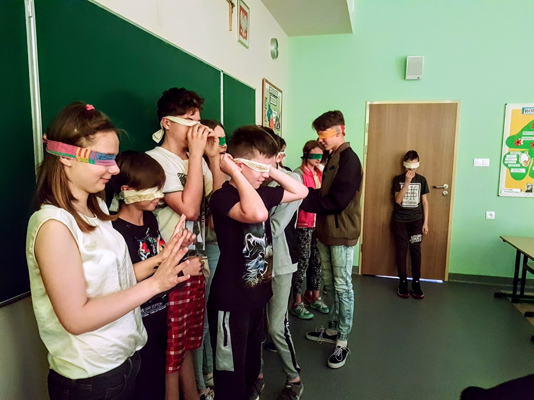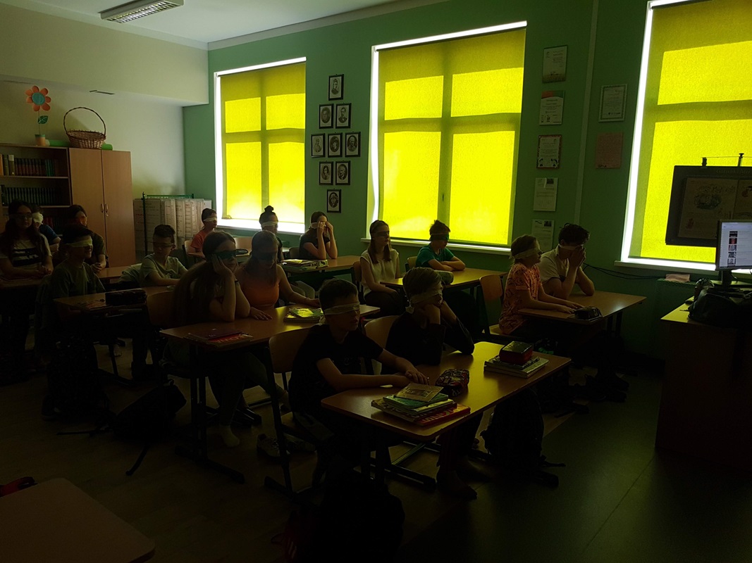Uczniowie klasy 6a, aby lepiej zrozumieć główną bohaterkę z lektury „Katarynka” na jedną godzinę lekcyjną, zostali pozbawieni możliwości widzenia. Każdy mógł poczuć na własnej skórze, jak ciężko jest osobom niewidomym. Uczniowie próbowali wykonywać czynności, które musiała wykonywać mała bohaterka. To było bardzo ciekawe doświadczenie dla wszystkich. Niezwykle wartościowe i budujące były refleksje szóstoklasistów po tym niestandardowym rozpoczęciu omawiania lektury. Okazało się, że później o wiele łatwej było im mówić o emocjach i uczuciach chorej dziewczynki, a także spostrzegli, iż bardzo mocno wyostrzyły im się inne zmysły.
