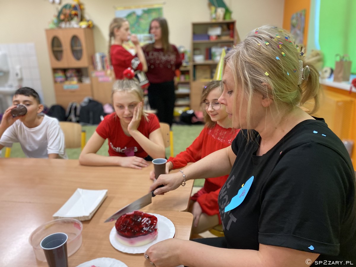 14 luty to oczywiście Dzień Świętego Walentego czyli Dzień Zakochanych. Uczniowie klasy VI a wyrażając swoje sympatie obdarowali się prezentami. Otrzymali również słodki prezent od Walentego, czyli od kochanych rodziców. Był to dzień pełen niespodzianek, a największą z nich było przygotowanie przez uczniów prezentów z okazji moich urodzin. Było konfetti, pyszny tort, szampan (oczywiście bezalkoholowy) i wiele prezentów. Oczywiście tylko ja nic nie wiedziałam o niespodziance, jaką przygotowali mi uczniowie, ale było pięknie. Napisaliście „Pani Wiola się nie złości, ale daje nam dużo miłości”, bo urodziny w taki dzień do czegoś zobowiązują- Kocham Was.
