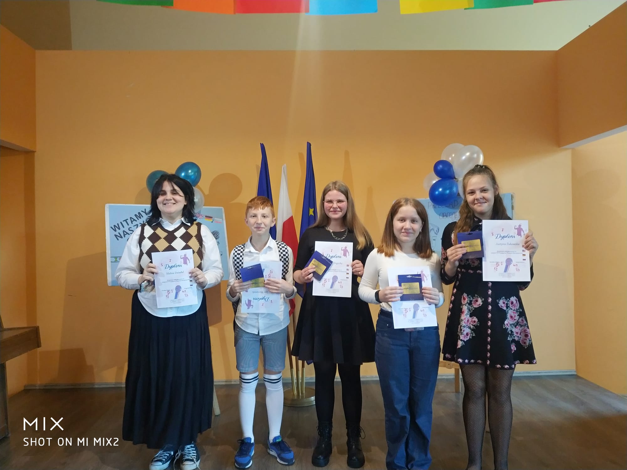 25.10.2021r. 5 uczniów naszej szkoły wystąpiło w IV Przeglądzie Piosenki Obcojęzycznej organizowanym przez nauczycieli języków obcych I Liceum Ogólnokształcącego im.B. Prusa w Żarach. Celem przeglądu była prezentacja umiejętności wokalnych i lingwistycznych, popularyzacja nauki języków obcych przez śpiew, integracja środowisk i wymiana doświadczeń uczniów oraz nauczycieli języków obcych. Naszą szkołę godnie reprezentowali wybrani uczniowie klas 7a, 7c i 8b. Luiza Sługocka wykonała utwór Billie Eilish pt:” When the party is over”, Joanna Kasprzyszak piosenkę Johna Legend pt:” All of me”, Malina Dziadul i Igor Mariański wystąpili w duecie wykonując utwór Britney Spears pt: „One more time”, a Justyna Żukowska zaśpiewała piosenkę Rihanny pt:” Diamonds”. Nasi uczniowie zaprezentowali swoje umiejętności na profesjonalnym, bardzo wysokim poziomie. Wszyscy uczestnicy przeglądu otrzymali dyplomy i nagrody za udział w tym wydarzeniu.
