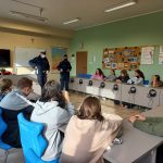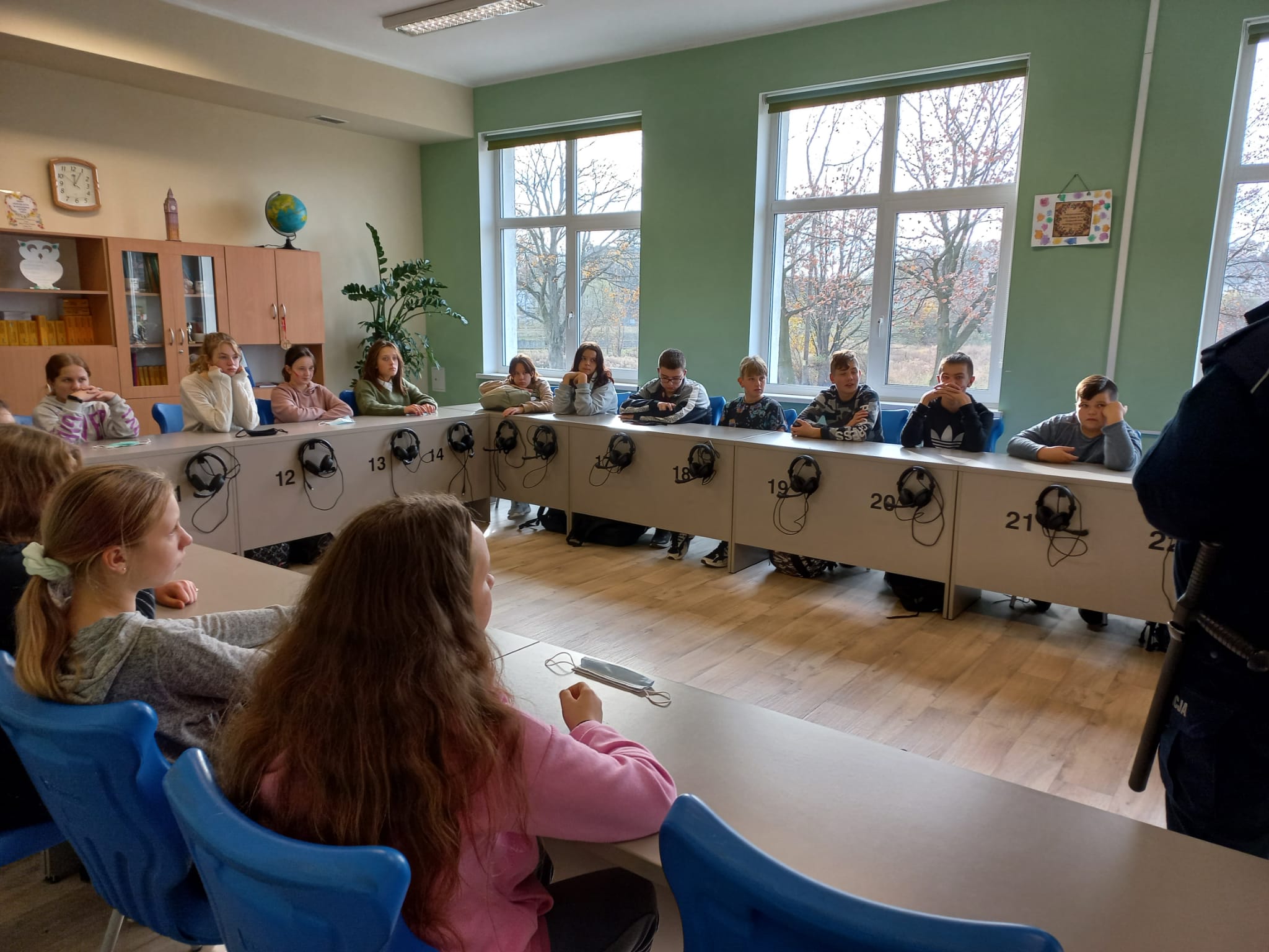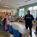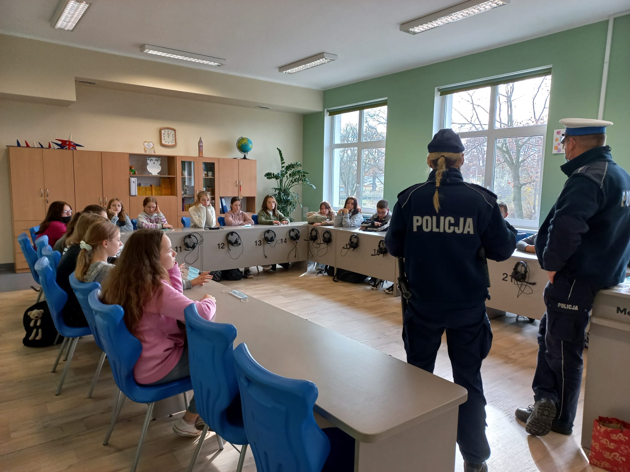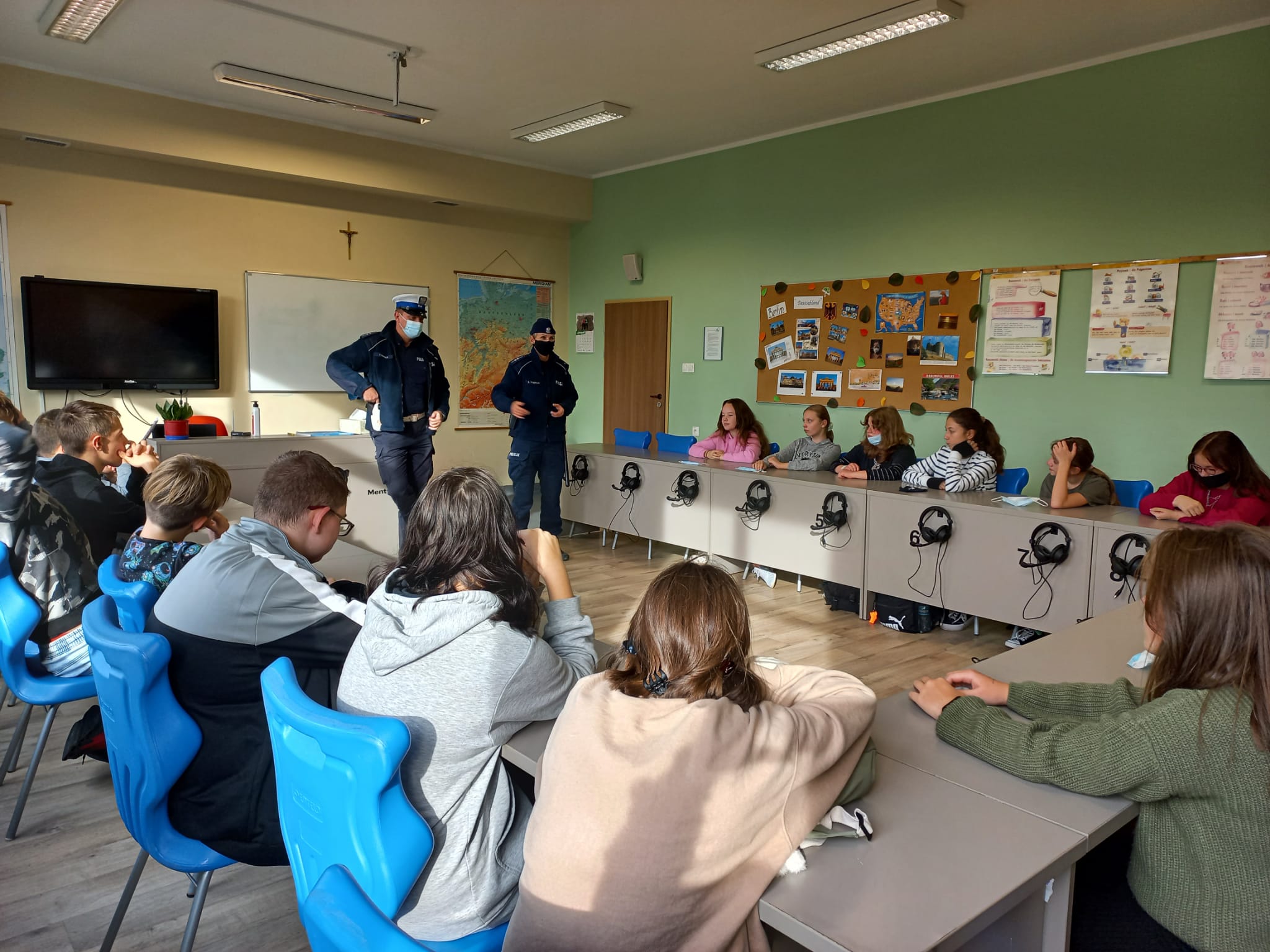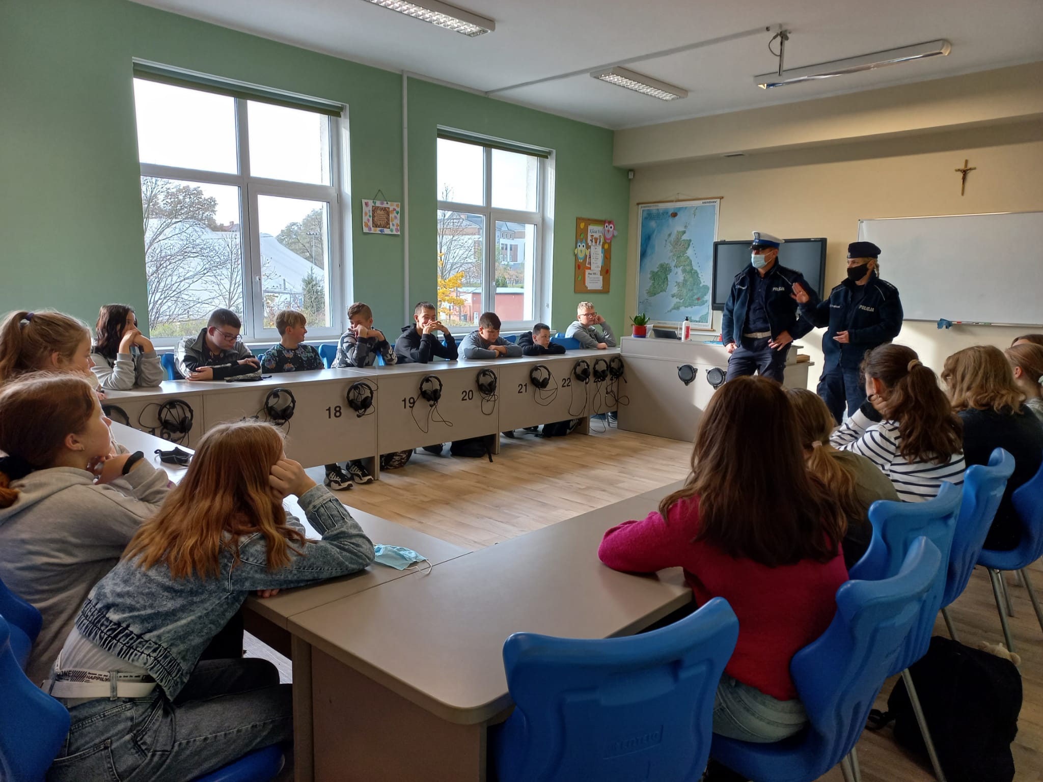 Na godzinę wychowawczą w klasie 7c zostali zaproszeni funkcjonariusze policji, którzy rozmawiali z uczniami na temat bezpieczeństwa na drodze, w szkole i w domu oraz na tematy związane z cyberprzemocą. Uczniowie dowiedzieli się, gdzie szukać pomocy w trudnej sytuacji oraz jakie konsekwencje wynikają z łamania ustalonych zasad i regulaminu. Na zakończenie wizyty uczniowie otrzymali opaski odblaskowe, aby droga do szkoły i domu była bezpieczna.