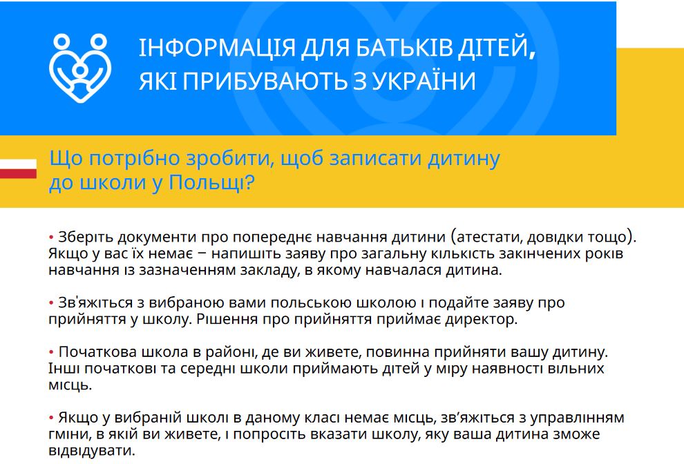 Informacja dla rodziców dzieci przybywających z Ukrainy / ІНФОРМАЦІЯ ДЛЯ БАТЬКІВ ДІТЕЙ, ЯКІ ПРИБУВАЮТЬ З УКРАЇНИ