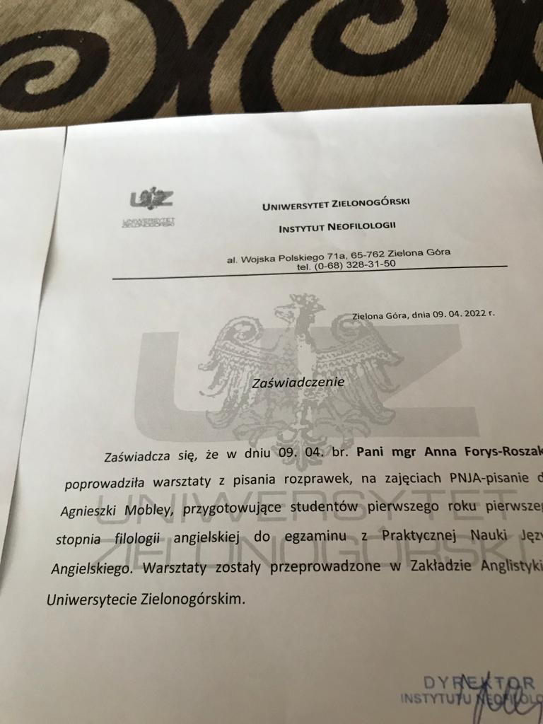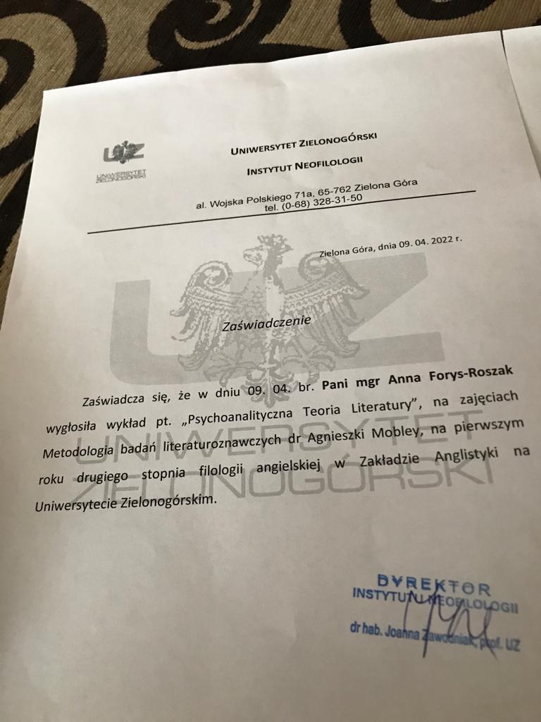 9.04 br. Anna Forys-Roszak wygłosiła wykład pt. ,,Psychoanalityczna Teoria Literatury”,na zajęciach Metodologia badań literaturoznawczych dr Agnieszki Mobley na zajęciach drugiego stopnia filologii angielskiej w zakładzie Anglistyki na Uniwersytecie Zielonogórskim. W tym samym dniu , na zaproszenie dr Agnieszki Mobley, Pani Anna Forys-Roszak prowadziła również warsztaty z pisania rozprawek , na zajęciach PNJA, przygotowując uczniów pierwszego roku stopnia filologii angielskiej do egzaminu z Praktycznej Nauki Języka.