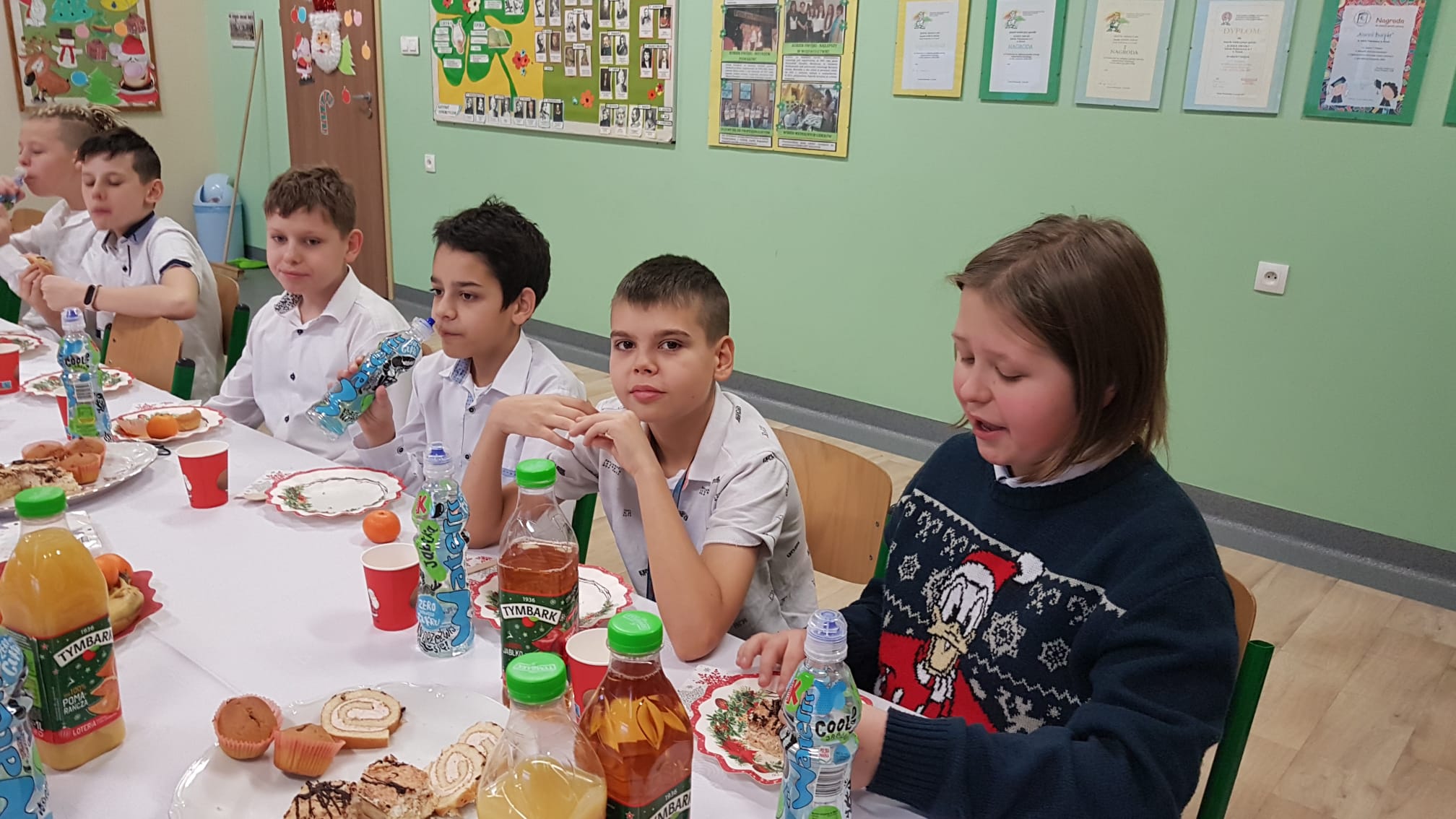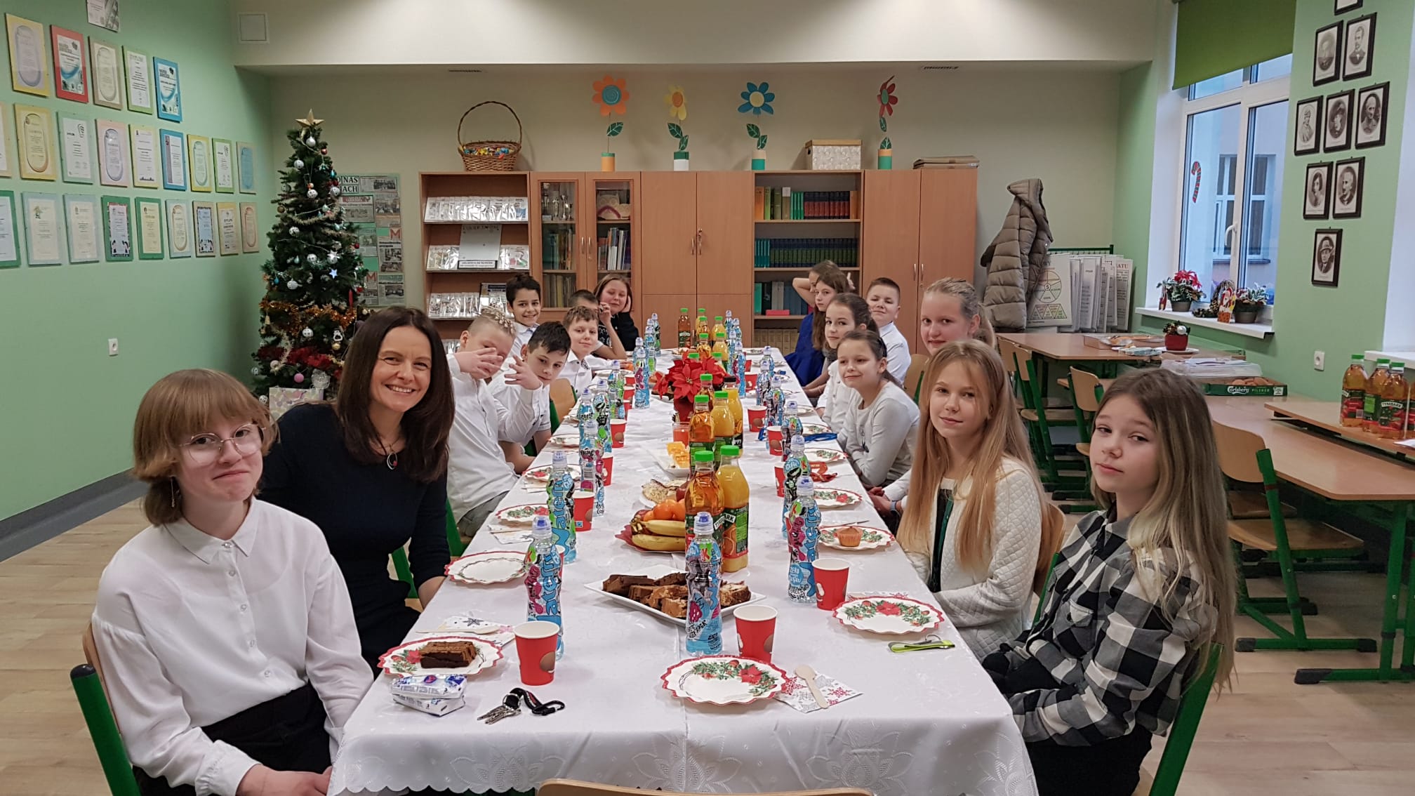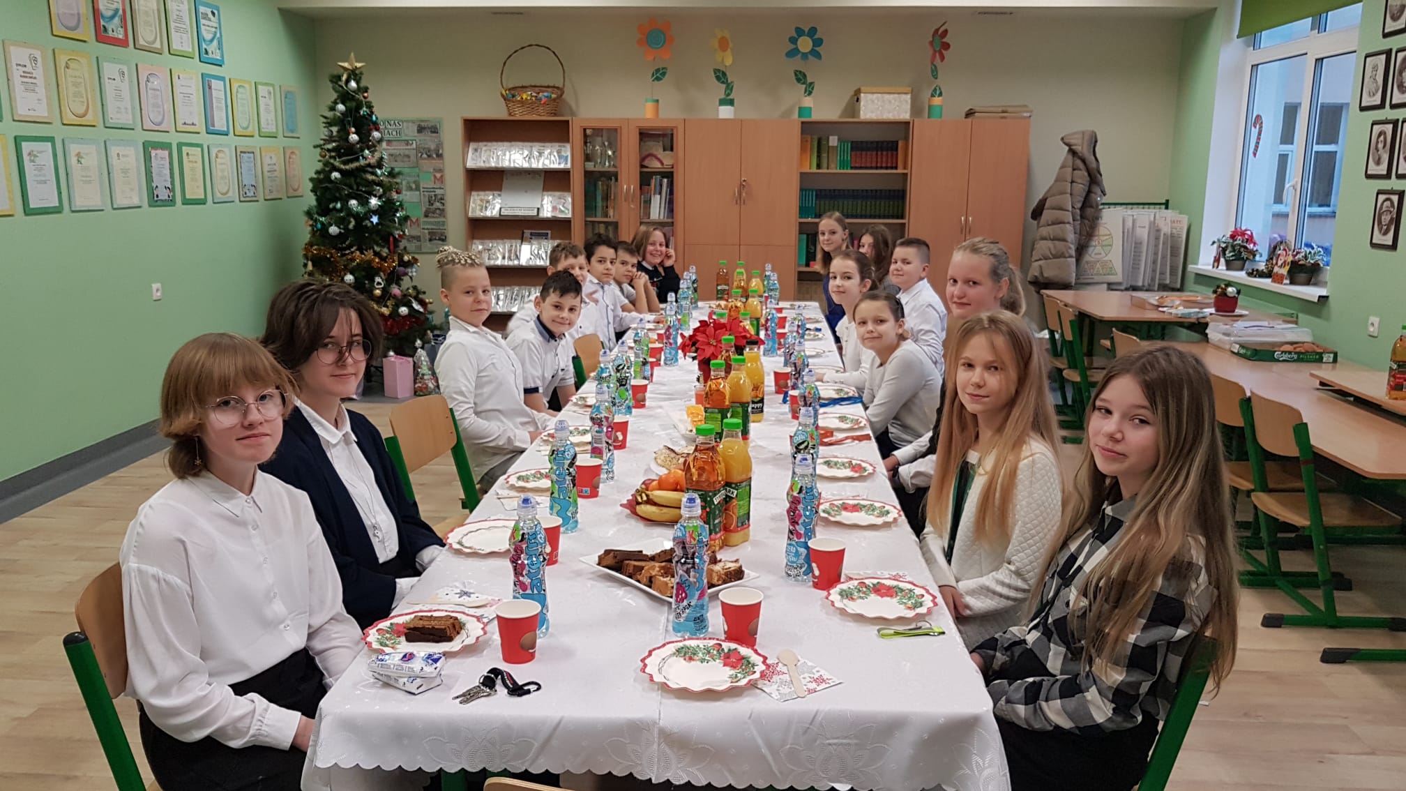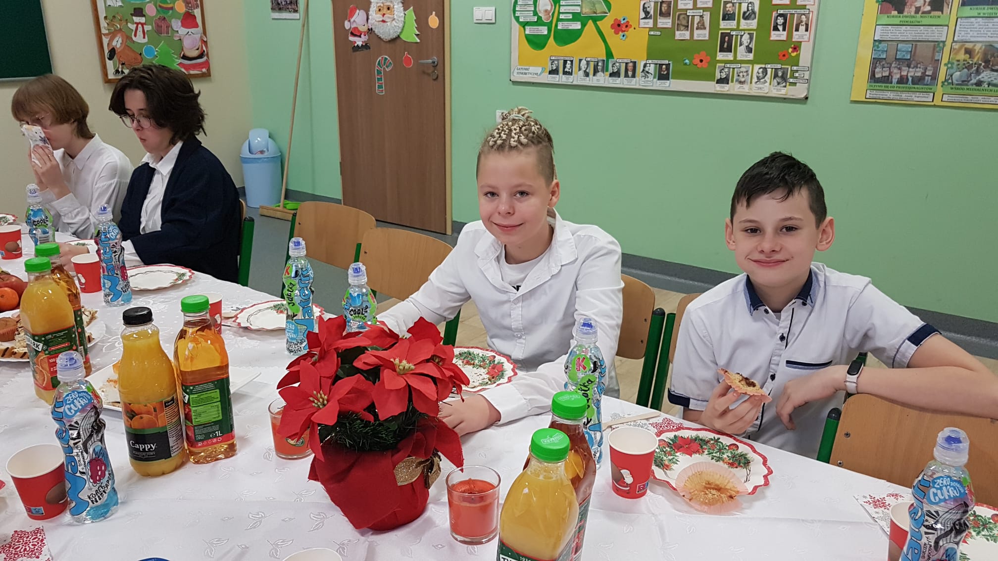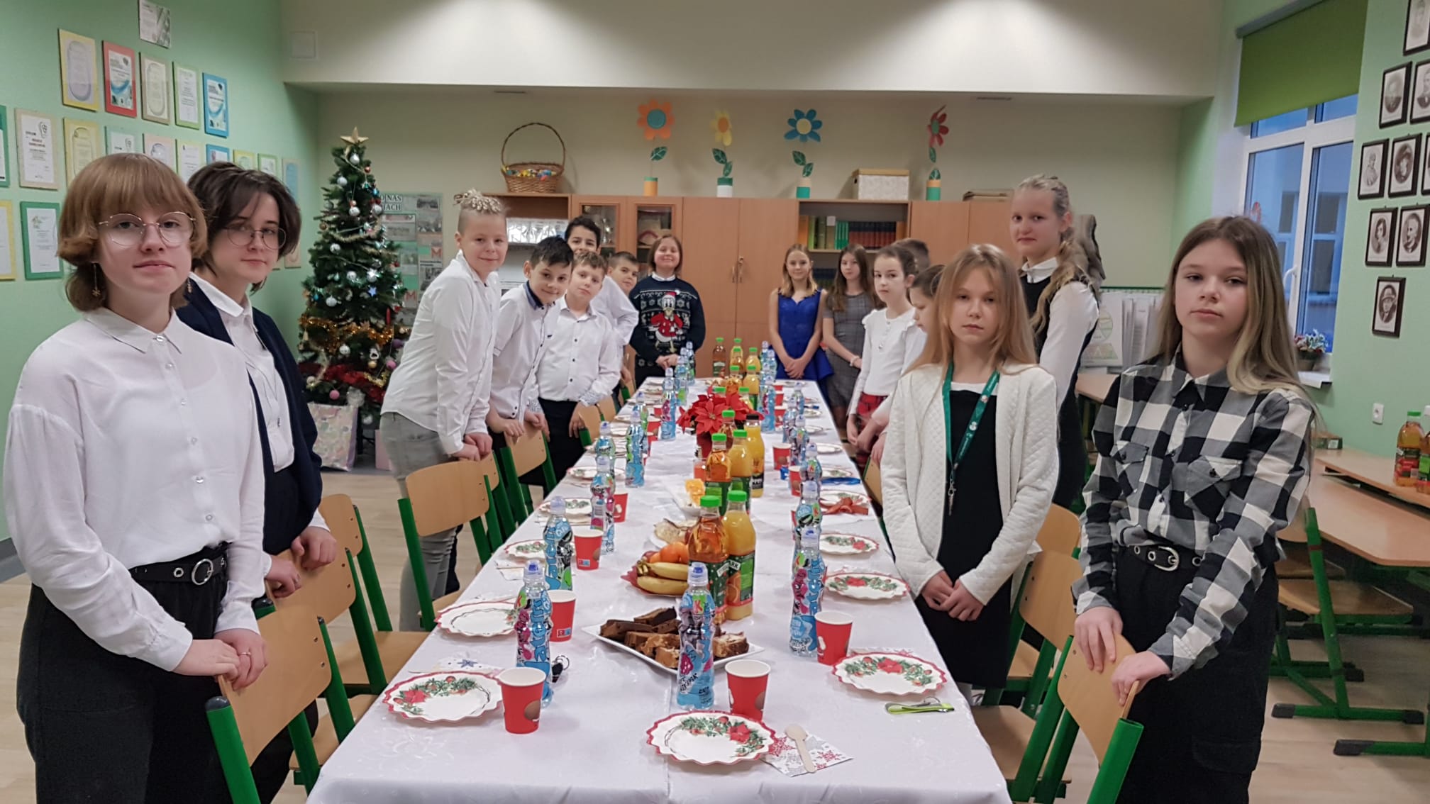 22 grudnia w klasie 6b odbyła się wigilia klasowa. Pięknie udekorowany stół, choinka, świąteczna muzyka wprowadziła wszystkich w podniosły nastrój. Uroczystość rozpoczęła się od dzielenia się opłatkiem i złożenia sobie świątecznych życzeń. Następnie uczniowie zasiedli przy wspólnym stole i zajadali słodkości przygotowane przez rodziców. Był też czas na wspólne śpiewanie kolęd i prezenty, które szóstoklasiści przygotowywali sobie własnoręcznie. Upominki były niezwykle kreatywne i wszystkim się podobały. Uczniowie tego dnia przygotowali również urodzinową niespodziankę dla wychowawczyni. Jakież było zdziwienie i ogromne zaskoczenie pani, gdy nagle weszli do klasy z prezentem, śpiewając „Sto lat! Sto lat!”. Widząc swoich wspaniałych i kochanych podopiecznych, pani Jola wzruszyła się ze szczęścia. Spotkanie upłynęło w bardzo miłej i rodzinnej atmosferze.