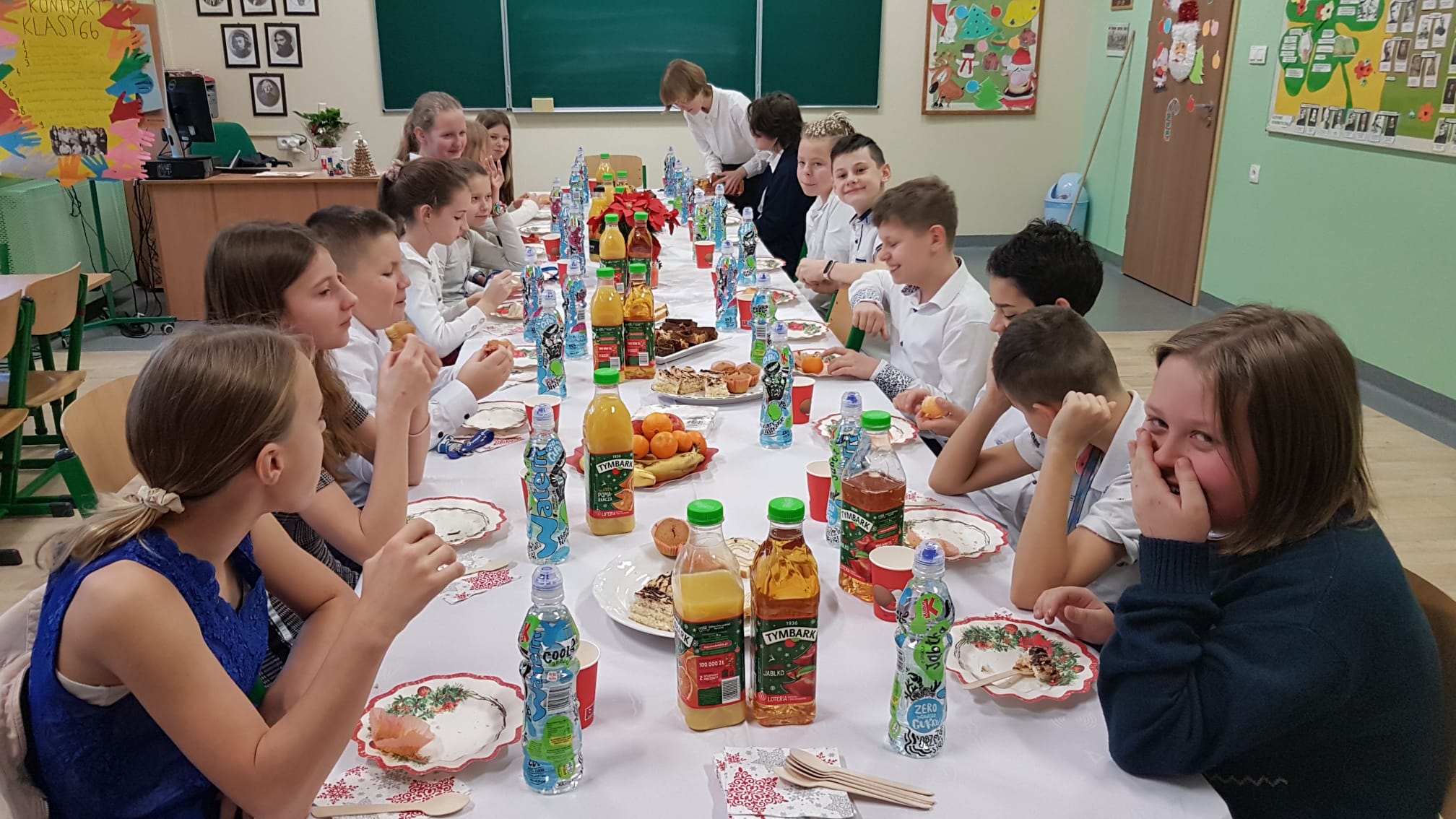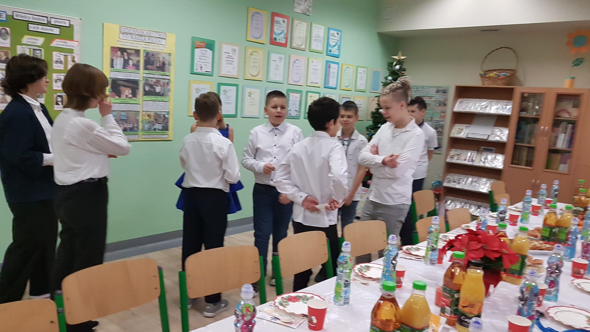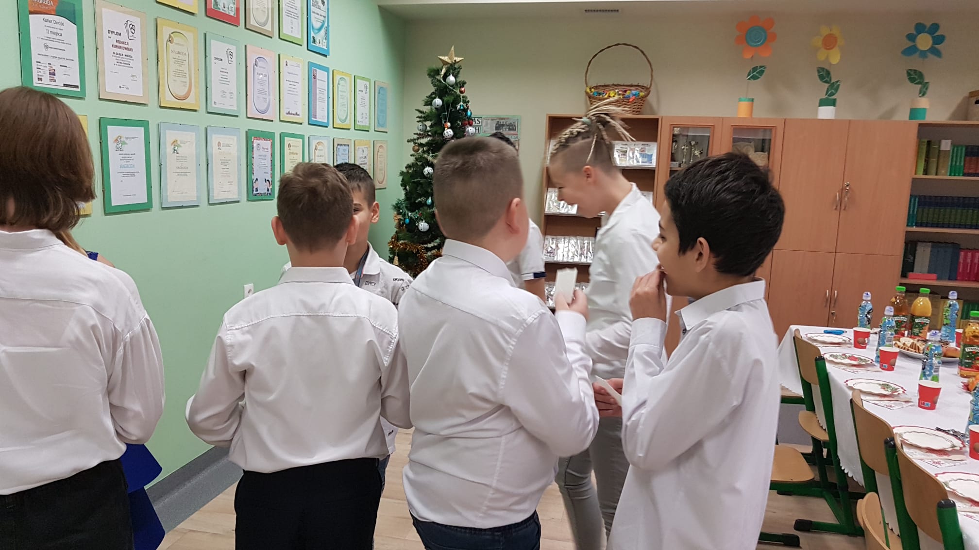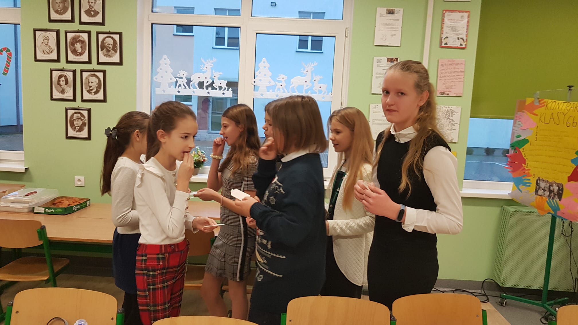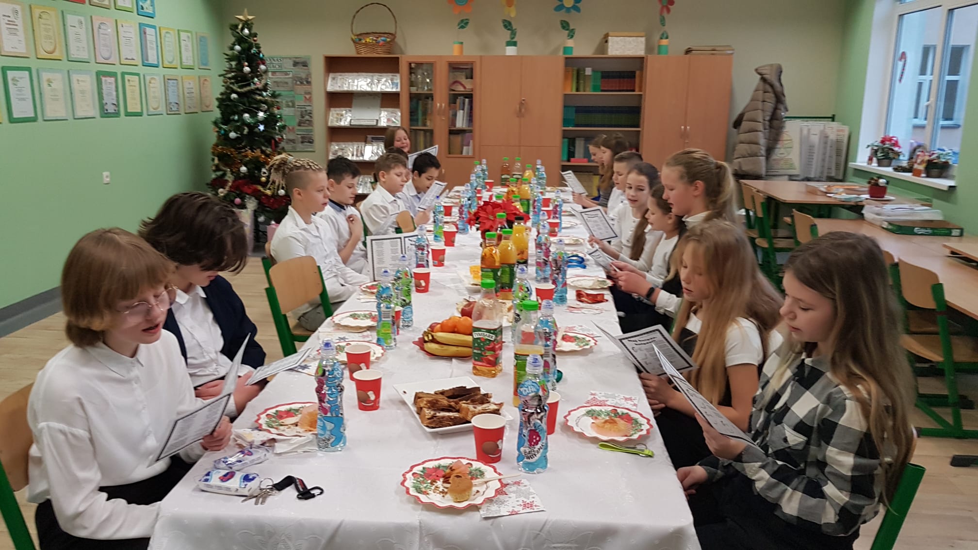 22 grudnia w klasie 6b odbyła się wigilia klasowa. Pięknie udekorowany stół, choinka, świąteczna muzyka wprowadziła wszystkich w podniosły nastrój. Uroczystość rozpoczęła się od dzielenia się opłatkiem i złożenia sobie świątecznych życzeń. Następnie uczniowie zasiedli przy wspólnym stole i zajadali słodkości przygotowane przez rodziców. Był też czas na wspólne śpiewanie kolęd i prezenty, które szóstoklasiści przygotowywali sobie własnoręcznie. Upominki były niezwykle kreatywne i wszystkim się podobały. Uczniowie tego dnia przygotowali również urodzinową niespodziankę dla wychowawczyni. Jakież było zdziwienie i ogromne zaskoczenie pani, gdy nagle weszli do klasy z prezentem, śpiewając „Sto lat! Sto lat!”. Widząc swoich wspaniałych i kochanych podopiecznych, pani Jola wzruszyła się ze szczęścia. Spotkanie upłynęło w bardzo miłej i rodzinnej atmosferze.