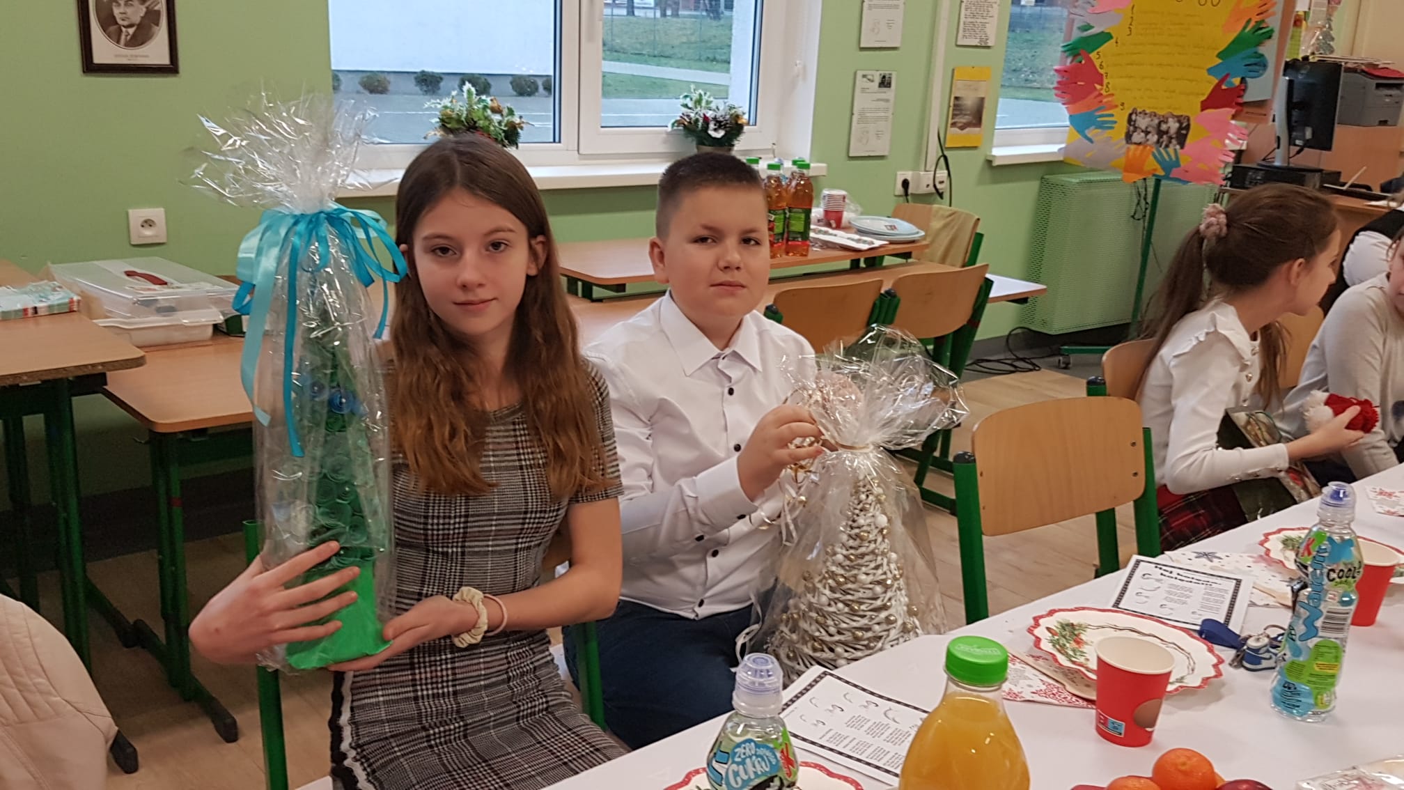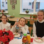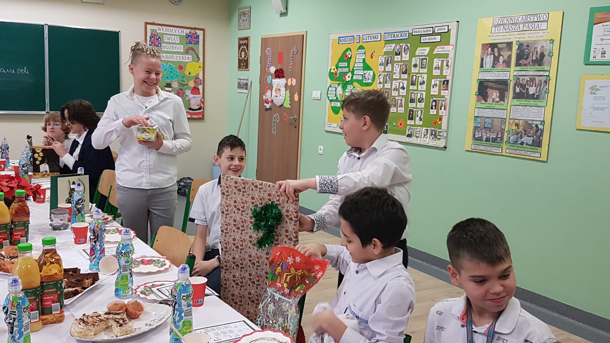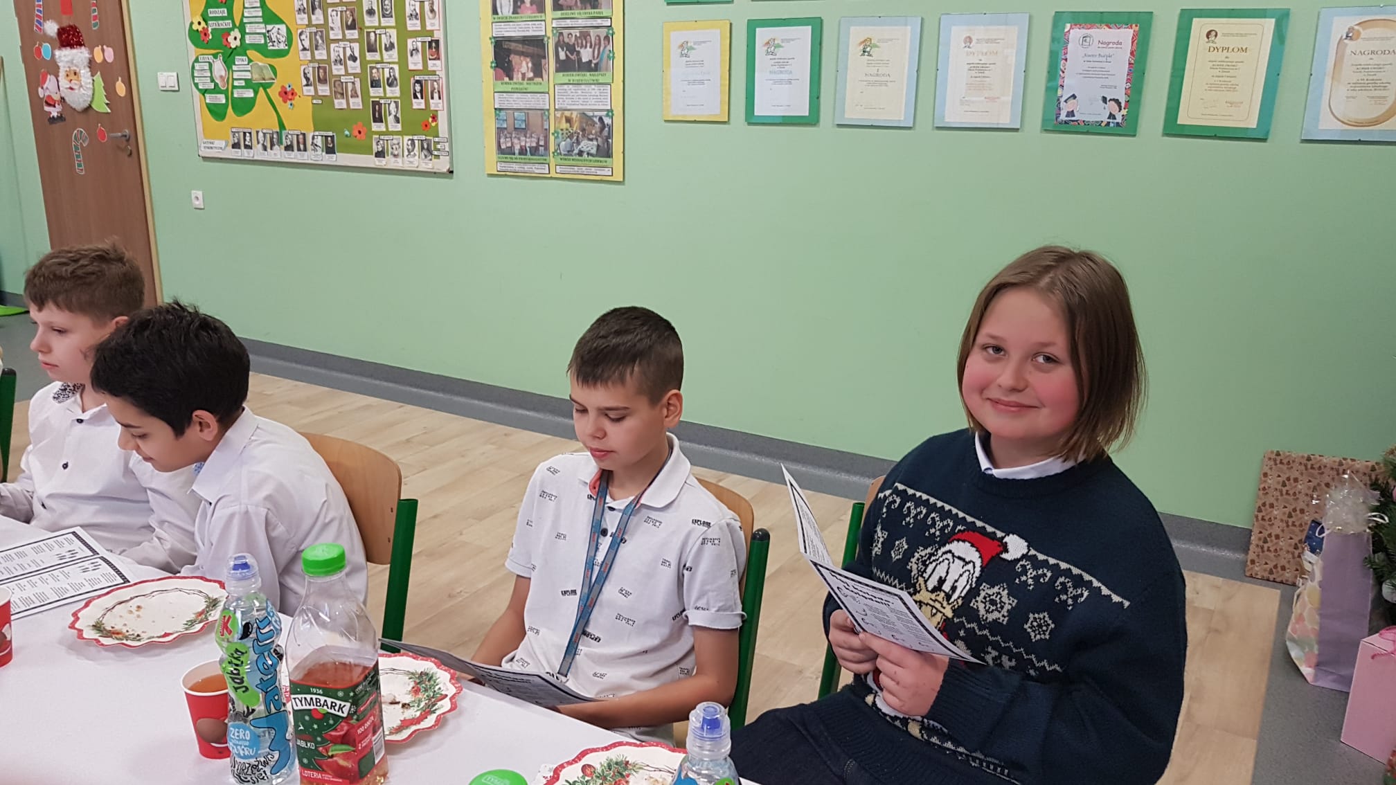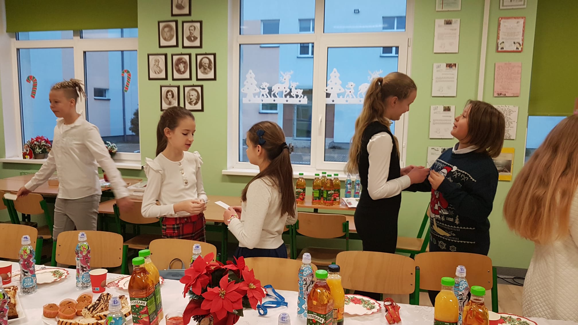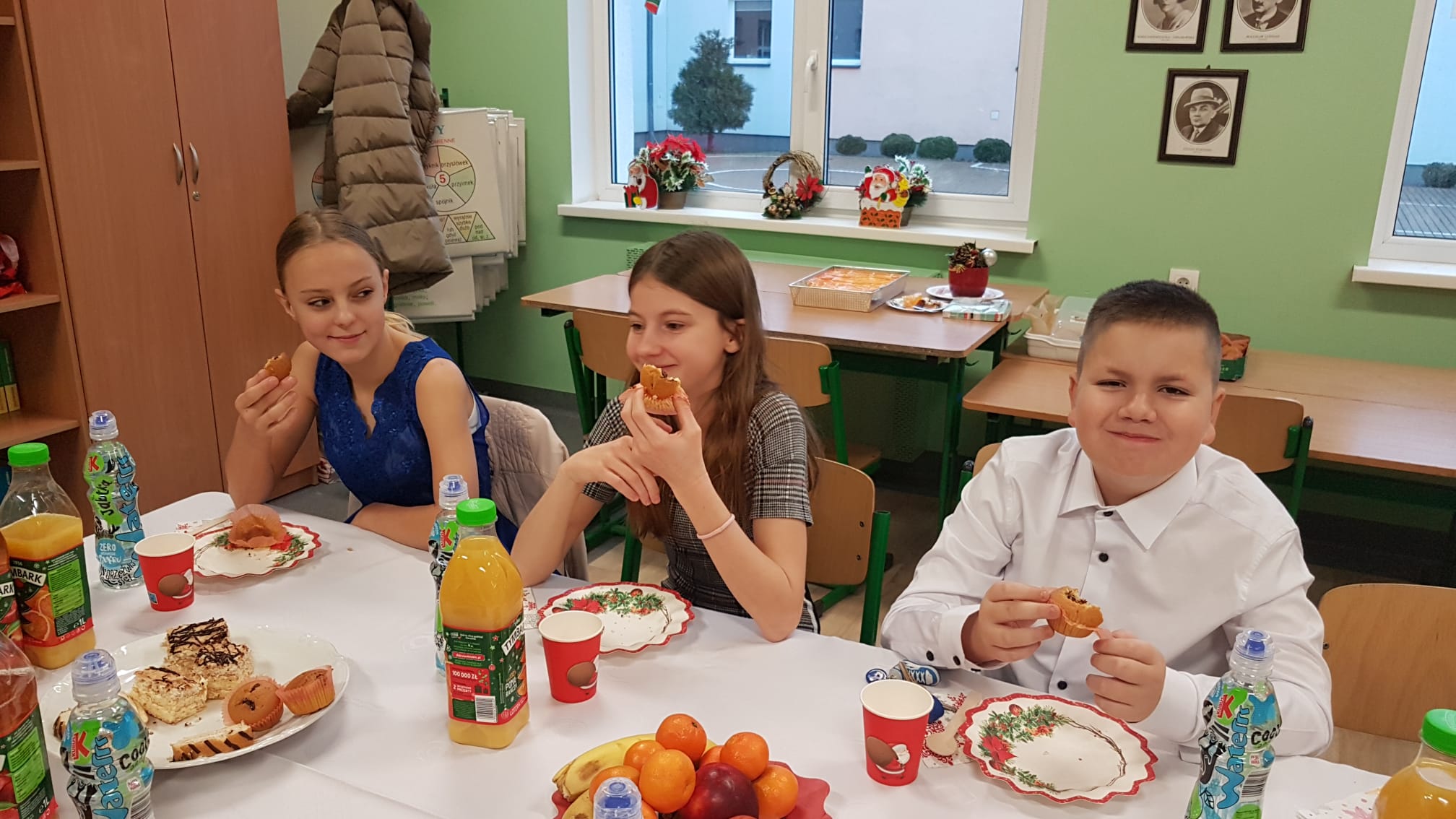 22 grudnia w klasie 6b odbyła się wigilia klasowa. Pięknie udekorowany stół, choinka, świąteczna muzyka wprowadziła wszystkich w podniosły nastrój. Uroczystość rozpoczęła się od dzielenia się opłatkiem i złożenia sobie świątecznych życzeń. Następnie uczniowie zasiedli przy wspólnym stole i zajadali słodkości przygotowane przez rodziców. Był też czas na wspólne śpiewanie kolęd i prezenty, które szóstoklasiści przygotowywali sobie własnoręcznie. Upominki były niezwykle kreatywne i wszystkim się podobały. Uczniowie tego dnia przygotowali również urodzinową niespodziankę dla wychowawczyni. Jakież było zdziwienie i ogromne zaskoczenie pani, gdy nagle weszli do klasy z prezentem, śpiewając „Sto lat! Sto lat!”. Widząc swoich wspaniałych i kochanych podopiecznych, pani Jola wzruszyła się ze szczęścia. Spotkanie upłynęło w bardzo miłej i rodzinnej atmosferze.