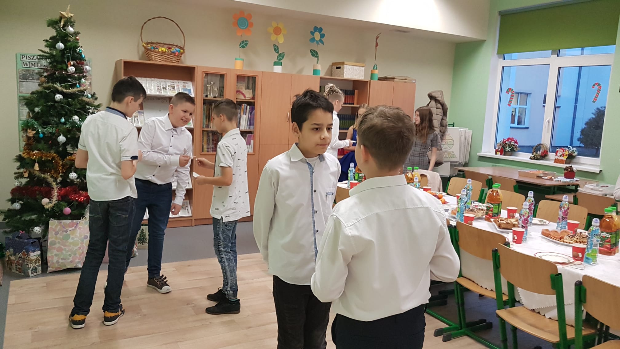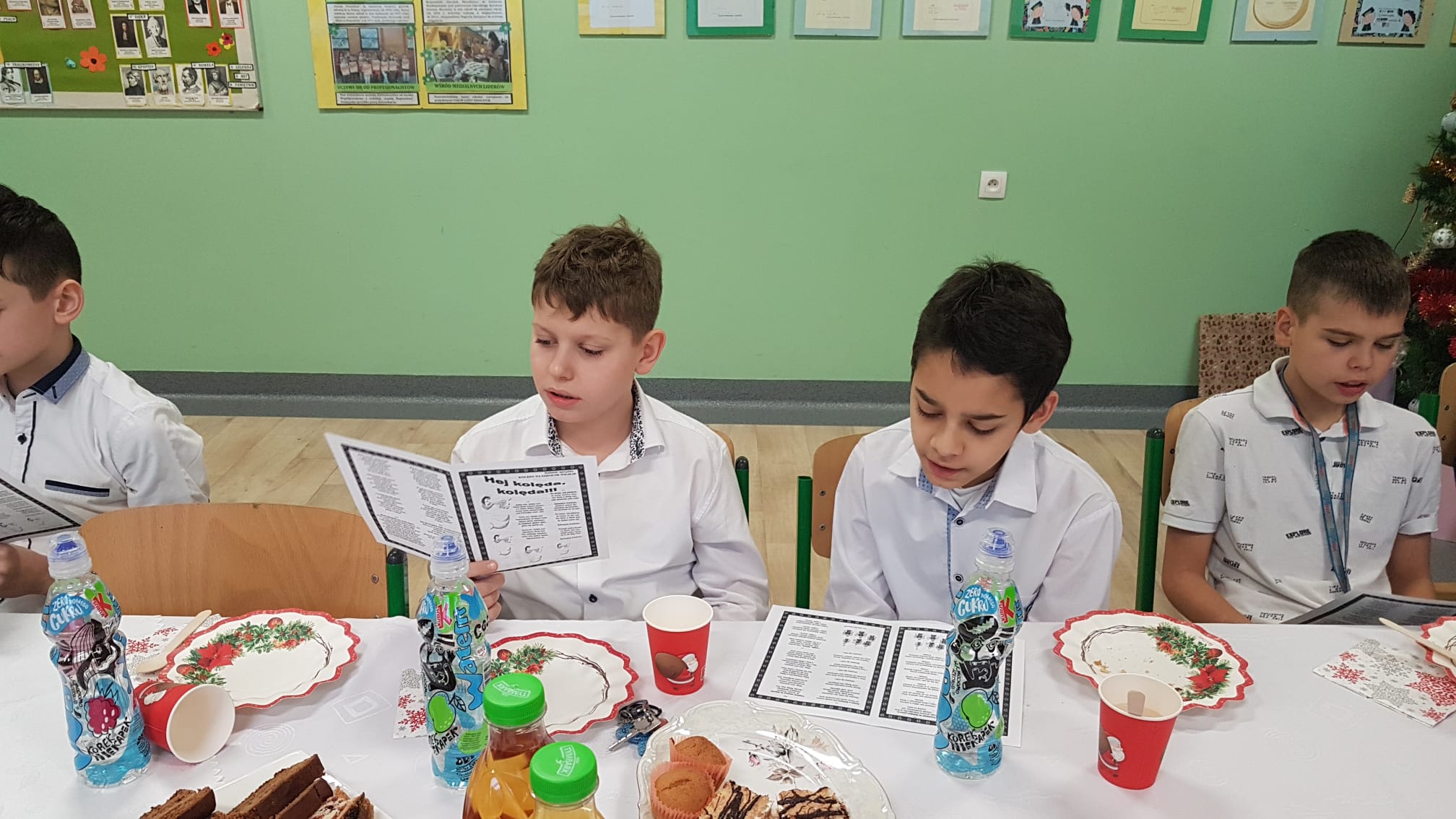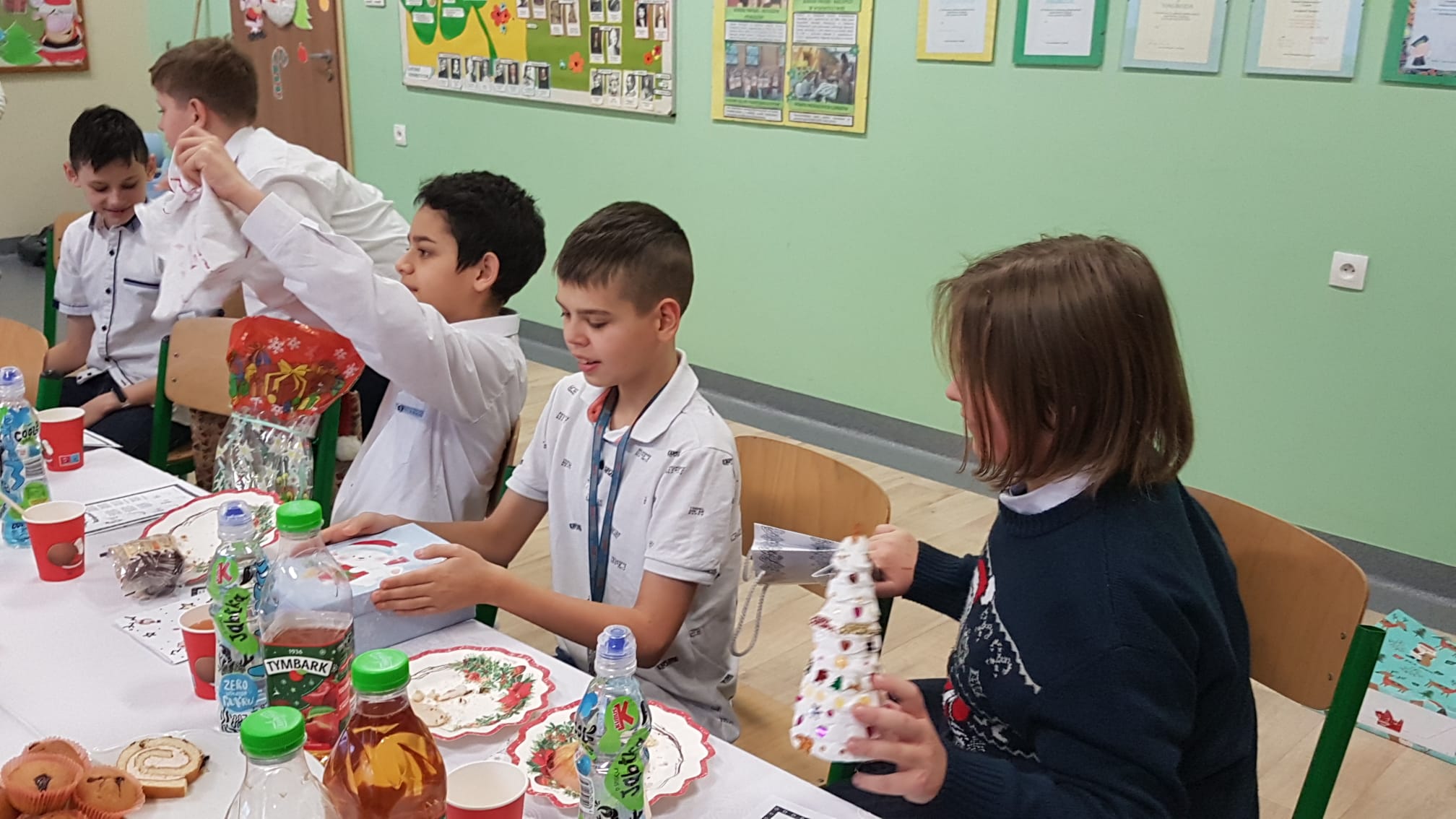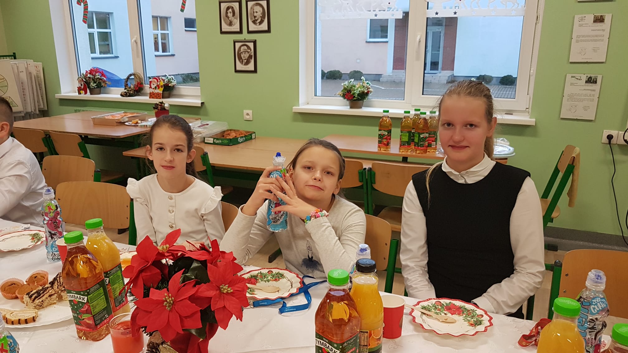 22 grudnia w klasie 6b odbyła się wigilia klasowa. Pięknie udekorowany stół, choinka, świąteczna muzyka wprowadziła wszystkich w podniosły nastrój. Uroczystość rozpoczęła się od dzielenia się opłatkiem i złożenia sobie świątecznych życzeń. Następnie uczniowie zasiedli przy wspólnym stole i zajadali słodkości przygotowane przez rodziców. Był też czas na wspólne śpiewanie kolęd i prezenty, które szóstoklasiści przygotowywali sobie własnoręcznie. Upominki były niezwykle kreatywne i wszystkim się podobały. Uczniowie tego dnia przygotowali również urodzinową niespodziankę dla wychowawczyni. Jakież było zdziwienie i ogromne zaskoczenie pani, gdy nagle weszli do klasy z prezentem, śpiewając „Sto lat! Sto lat!”. Widząc swoich wspaniałych i kochanych podopiecznych, pani Jola wzruszyła się ze szczęścia. Spotkanie upłynęło w bardzo miłej i rodzinnej atmosferze.