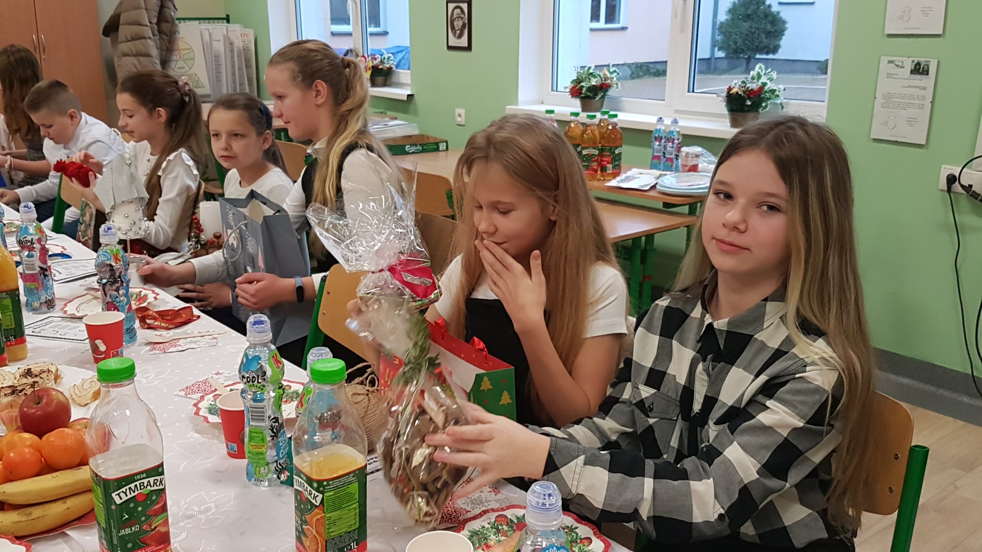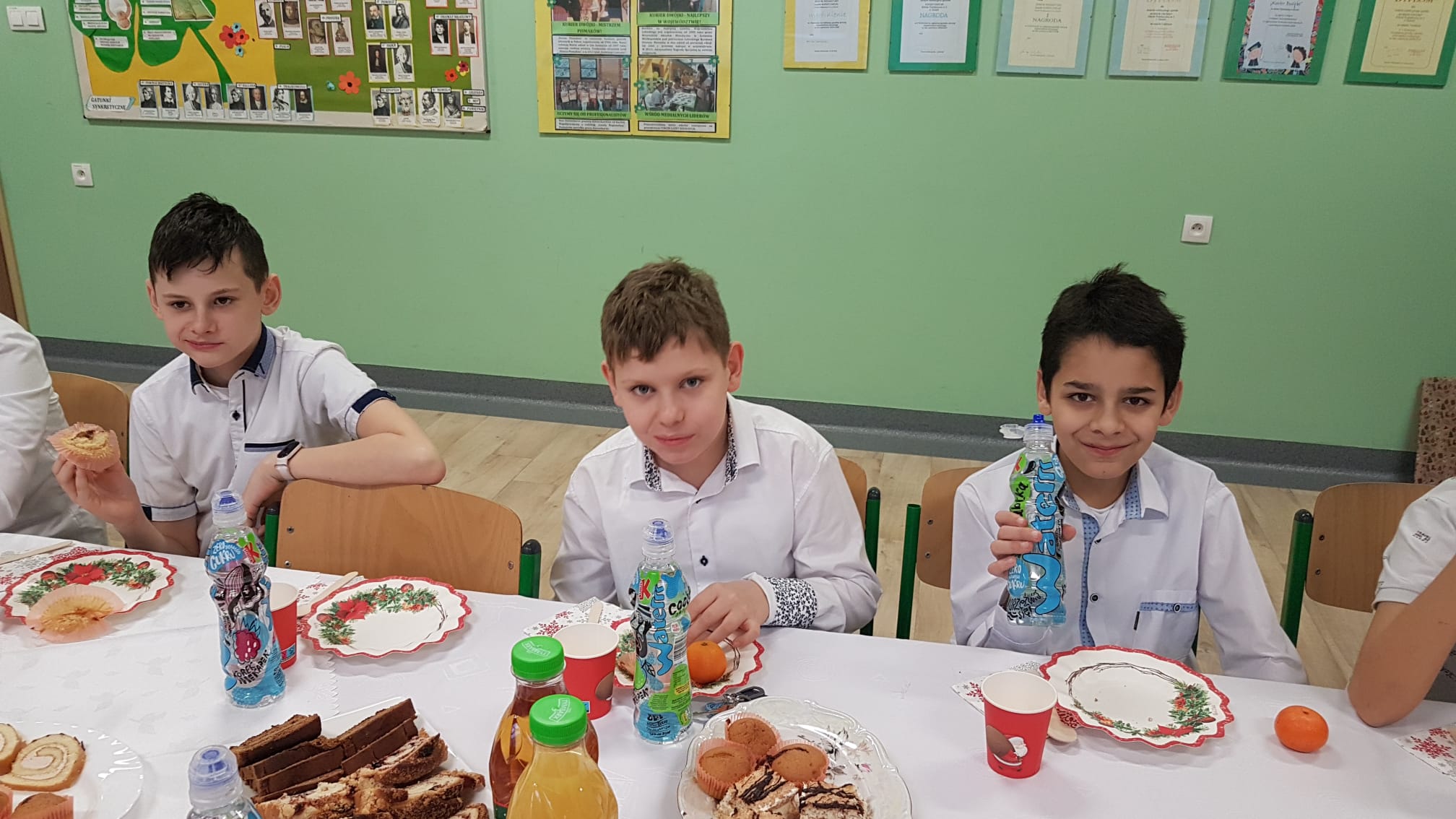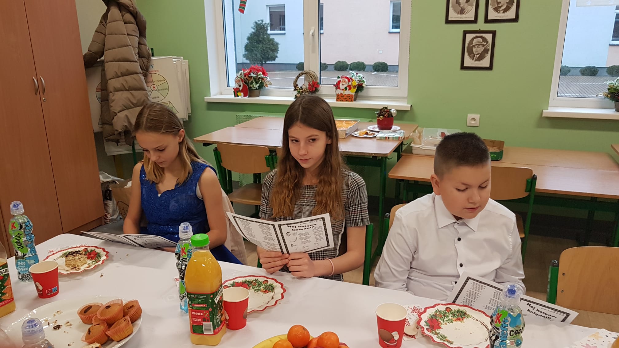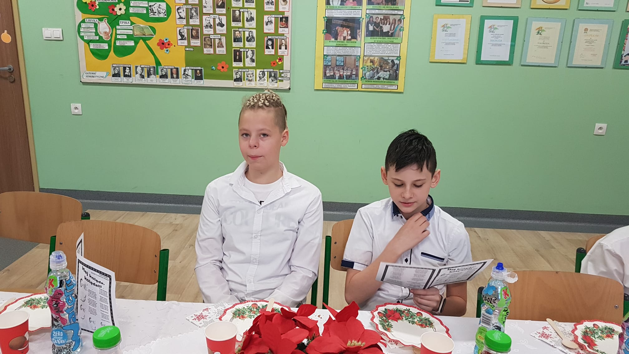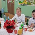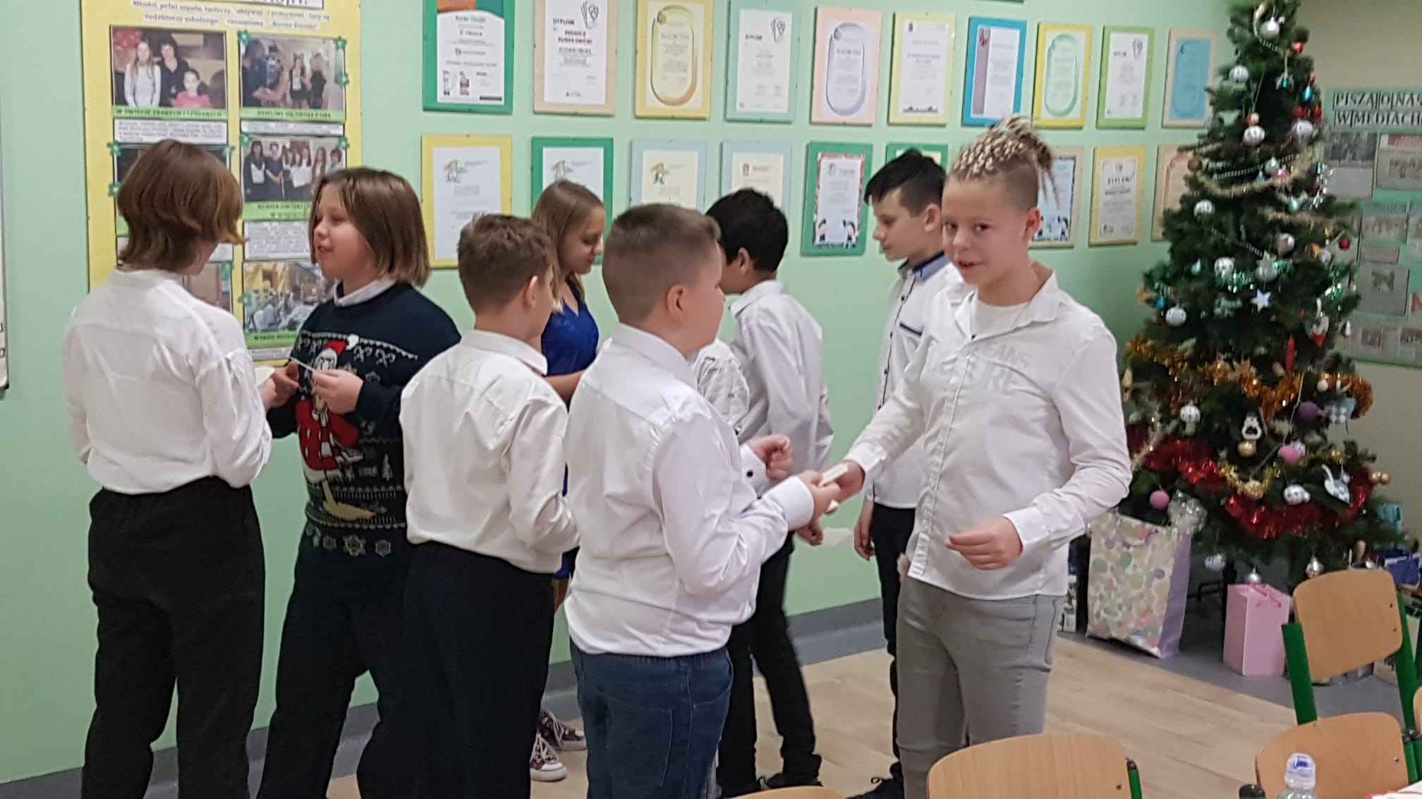 22 grudnia w klasie 6b odbyła się wigilia klasowa. Pięknie udekorowany stół, choinka, świąteczna muzyka wprowadziła wszystkich w podniosły nastrój. Uroczystość rozpoczęła się od dzielenia się opłatkiem i złożenia sobie świątecznych życzeń. Następnie uczniowie zasiedli przy wspólnym stole i zajadali słodkości przygotowane przez rodziców. Był też czas na wspólne śpiewanie kolęd i prezenty, które szóstoklasiści przygotowywali sobie własnoręcznie. Upominki były niezwykle kreatywne i wszystkim się podobały. Uczniowie tego dnia przygotowali również urodzinową niespodziankę dla wychowawczyni. Jakież było zdziwienie i ogromne zaskoczenie pani, gdy nagle weszli do klasy z prezentem, śpiewając „Sto lat! Sto lat!”. Widząc swoich wspaniałych i kochanych podopiecznych, pani Jola wzruszyła się ze szczęścia. Spotkanie upłynęło w bardzo miłej i rodzinnej atmosferze.