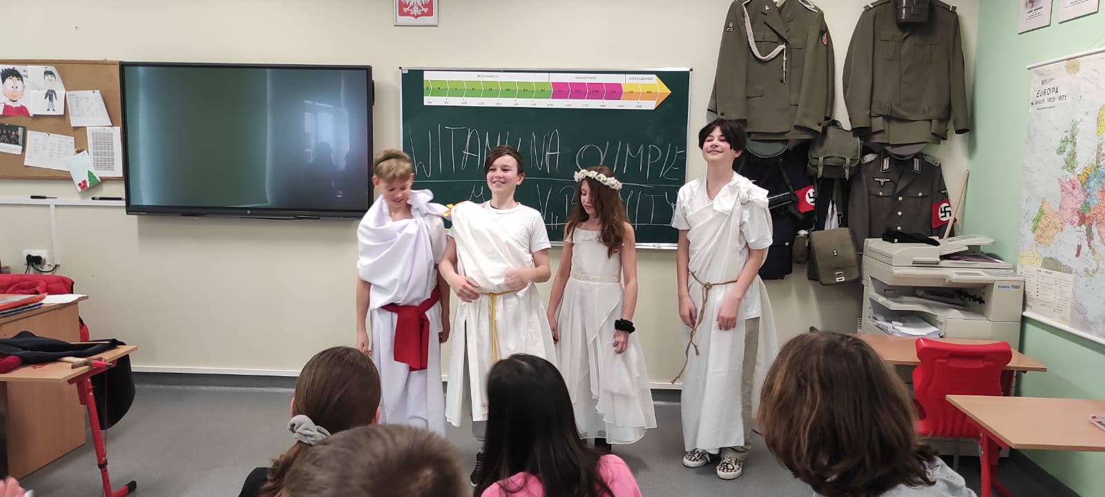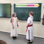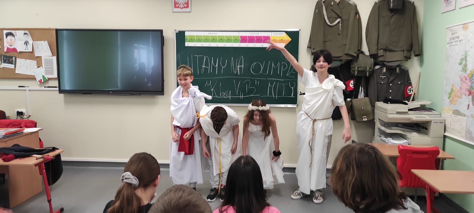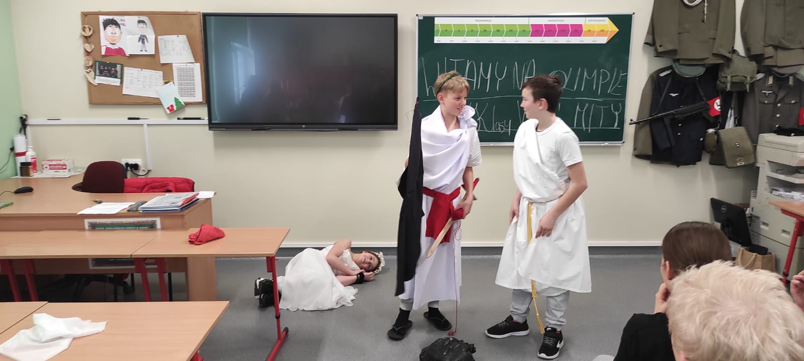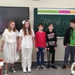 W środę 4 kwietnia klasą 5b miała nietypową lekcję powtórzeniową dotyczącą treści mitów. Uczniowie w grupach zaprezentowali krótkie inscenizacje wybranych przez siebie mitycznych historii. Sami napisali scenariusze, przygotowali kostiumy i rekwizyty.