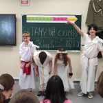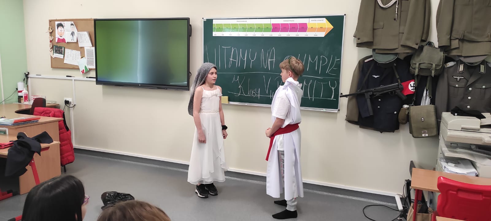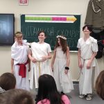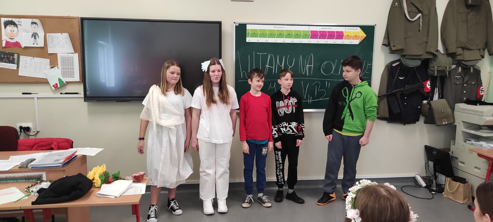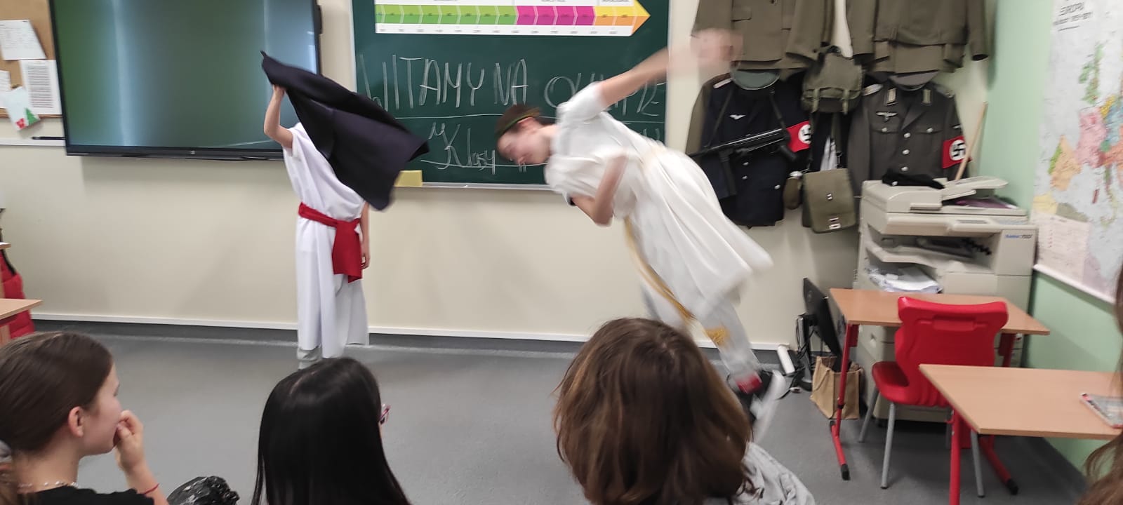 W środę 4 kwietnia klasą 5b miała nietypową lekcję powtórzeniową dotyczącą treści mitów. Uczniowie w grupach zaprezentowali krótkie inscenizacje wybranych przez siebie mitycznych historii. Sami napisali scenariusze, przygotowali kostiumy i rekwizyty.