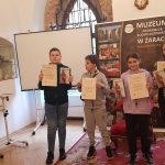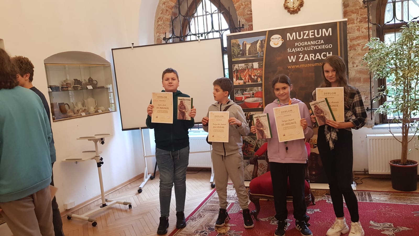 25.04.2024r. uczniowie SP2 z Żar kolejny raz ( ostatni w tym roku szkolnym)wzięli udział w IX Turnieju Wiedzy Historycznej organizowanym przez Muzeum Pogranicza Śląsko-Łużyckiego. Szymon Zaród z kl. 7b, Patrycja Buganik z kl. 6b, Maksymilian Drozdowski z kl.5b oraz Zuzanna Kacperska z kl. 6a pisali test pt. „Kultura i sztuka II Rzeczpospolitej „. Nasi uczestnicy po nierozstrzygniętej dogrywce zajęli ex aequo 3 miejsce. Uczestnikom konkursu życzymy sukcesów.