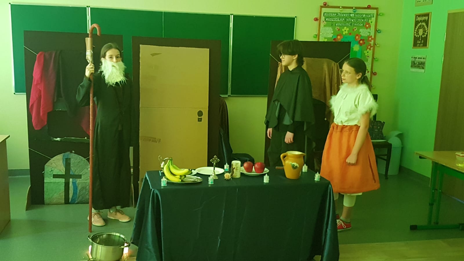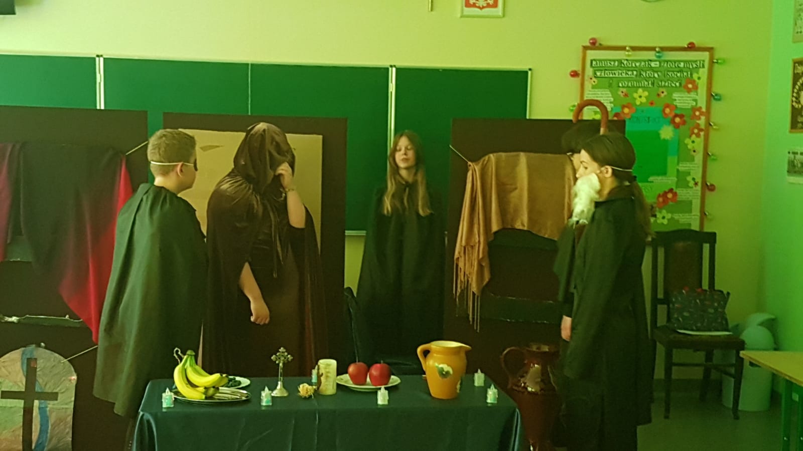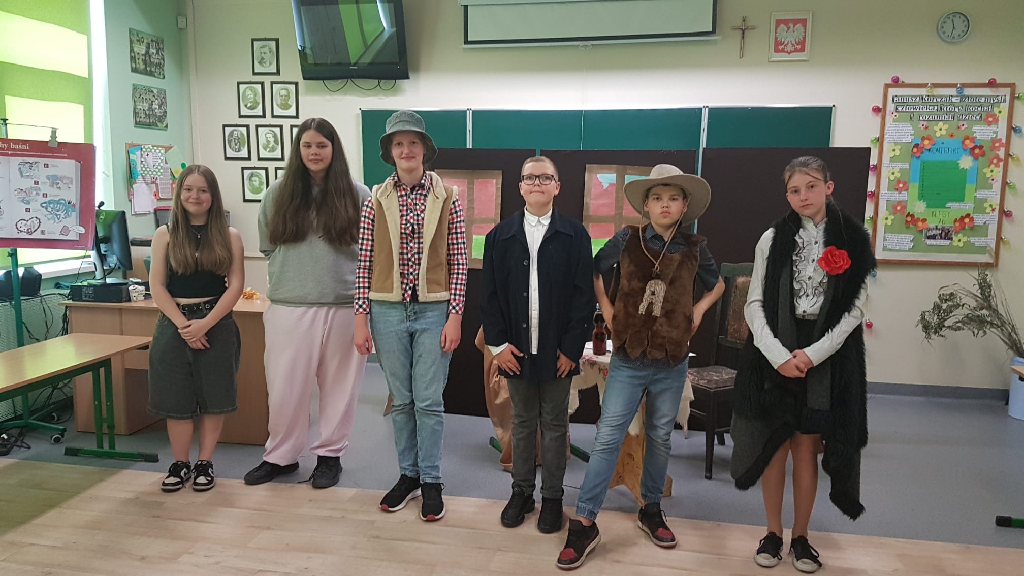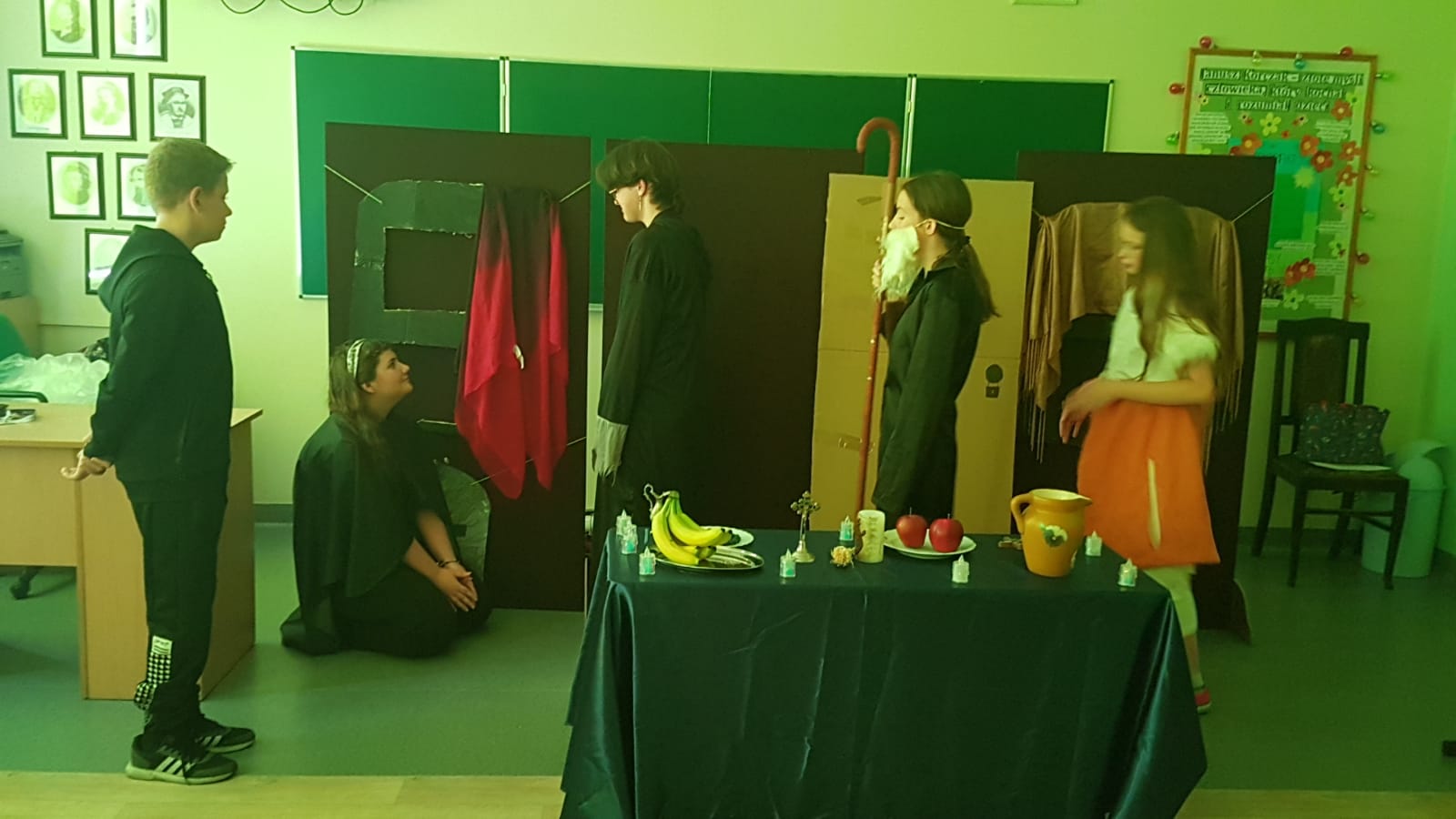 Uczniowie klasy 7b na lekcji języka polskiego próbowali swoich sił aktorskich. Wystawiali przedstawienia teatralne na podstawie lektur szkolnych: „Zemsta”, „Balladyna”, „Dziady cz.II”. Siódmoklasiści podzieleni na zespoły przygotowywali się do zaprezentowania swoich sztuk kilka tygodni. Podeszli do zadania bardzo odpowiedzialnie: zadbali o stosowne stroje, przygotowali rekwizyty, scenografię, muzykę, oświetlenie. Efekt był zaskakujący. 12 czerwca gabinet 42 zamienił się w prawdziwą salę teatralną. Młodzi aktorzy w barwny i oryginalny sposób ukazali tradycję odprawiania dziadów. Skłonili oglądających do refleksji dotyczących władzy, ambicji, przemyśleń na temat relacji międzyludzkich na podstawie losów Balladyny. Na koniec wywołali śmiech oglądających, prezentując zabawne historie z życia bohaterów „Zemsty”. Zaangażowanie uczniów klasy w przygotowanie inscenizacji było świetną okazją do integracji zespołu klasowego. Taka metoda lekcji języka polskiego to świetna forma zapamiętywania treści lektur szkolnych.