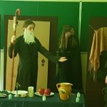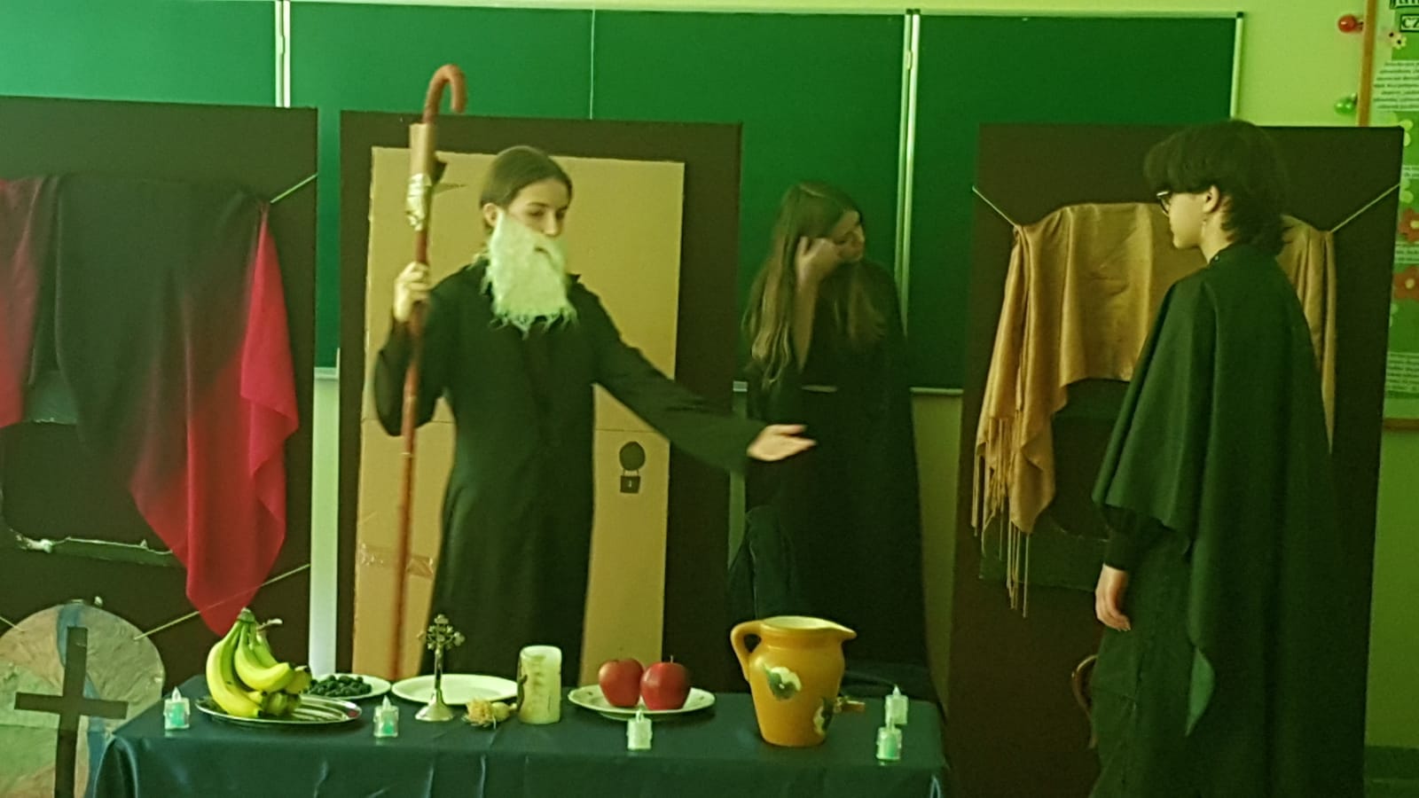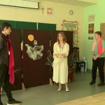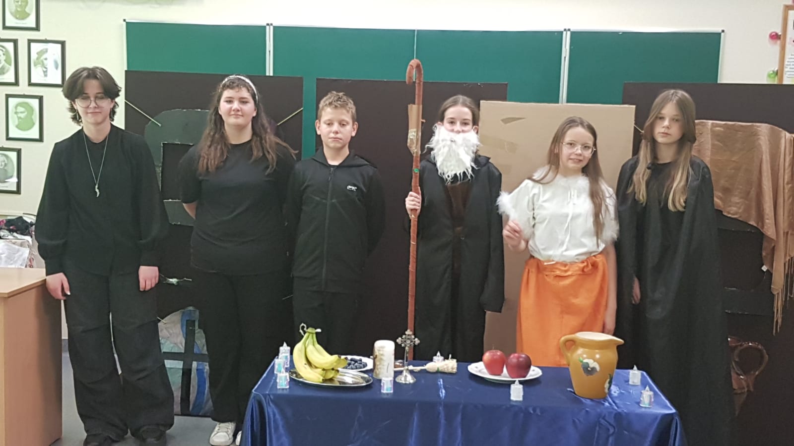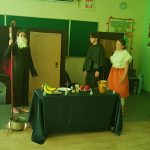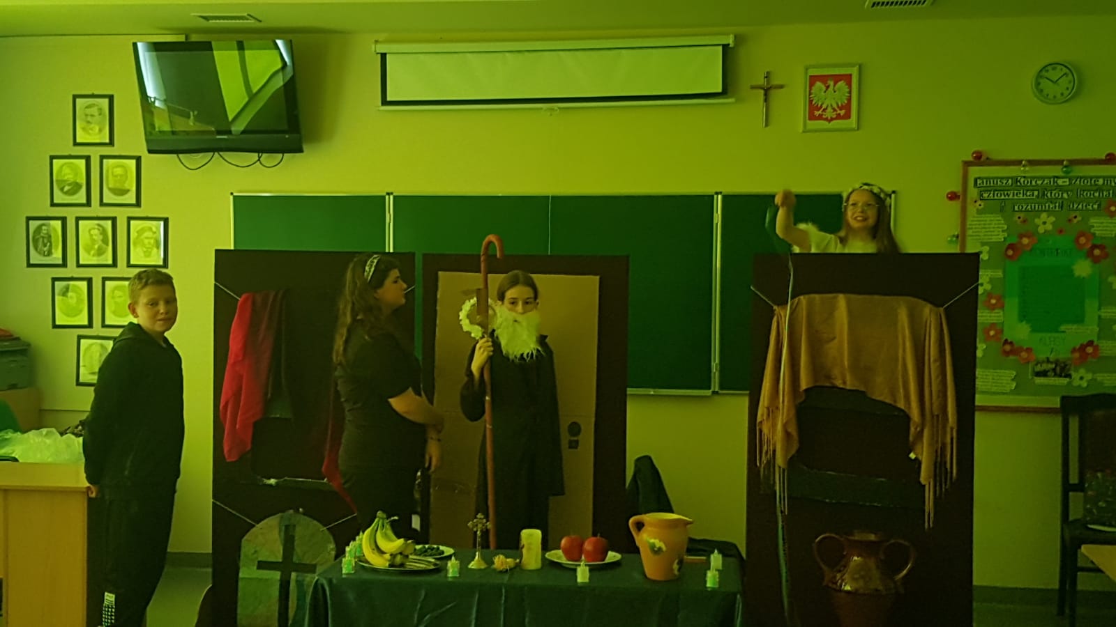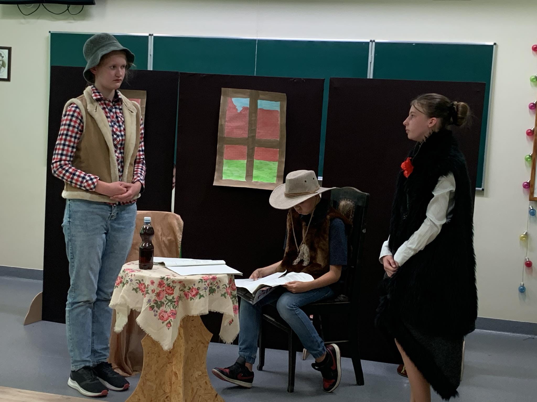 Uczniowie klasy 7b na lekcji języka polskiego próbowali swoich sił aktorskich. Wystawiali przedstawienia teatralne na podstawie lektur szkolnych: „Zemsta”, „Balladyna”, „Dziady cz.II”. Siódmoklasiści podzieleni na zespoły przygotowywali się do zaprezentowania swoich sztuk kilka tygodni. Podeszli do zadania bardzo odpowiedzialnie: zadbali o stosowne stroje, przygotowali rekwizyty, scenografię, muzykę, oświetlenie. Efekt był zaskakujący. 12 czerwca gabinet 42 zamienił się w prawdziwą salę teatralną. Młodzi aktorzy w barwny i oryginalny sposób ukazali tradycję odprawiania dziadów. Skłonili oglądających do refleksji dotyczących władzy, ambicji, przemyśleń na temat relacji międzyludzkich na podstawie losów Balladyny. Na koniec wywołali śmiech oglądających, prezentując zabawne historie z życia bohaterów „Zemsty”. Zaangażowanie uczniów klasy w przygotowanie inscenizacji było świetną okazją do integracji zespołu klasowego. Taka metoda lekcji języka polskiego to świetna forma zapamiętywania treści lektur szkolnych.